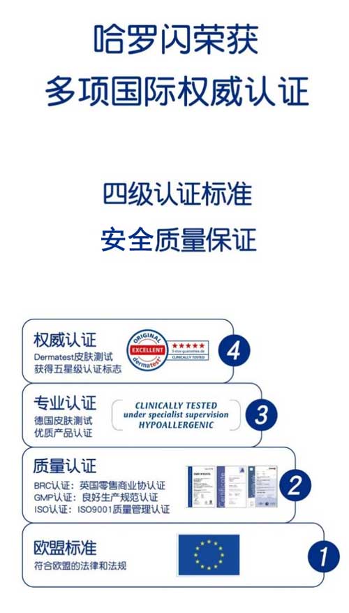 哈羅閃的產(chǎn)品研發(fā)、生產(chǎn)均符合歐盟標準,并擁有德國皮膚測試的優(yōu)質(zhì)產(chǎn)品認證;如,哈羅閃嬰兒凈護二合一洗發(fā)沐浴露、哈羅閃嬰兒柔護潤膚乳、哈羅閃嬰兒柔護按摩油、哈羅閃嬰兒溫和護膚霜等,均通過了德國權(quán)威皮膚科醫(yī)生協(xié)會認證Dermatest的皮膚測試,并獲得5星級認證,達到5星標準即代表產(chǎn)品通過極為嚴苛的檢測程序。