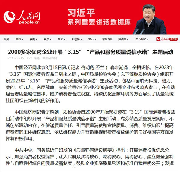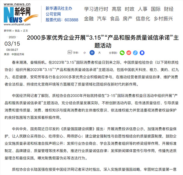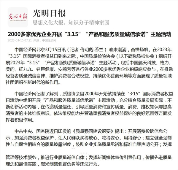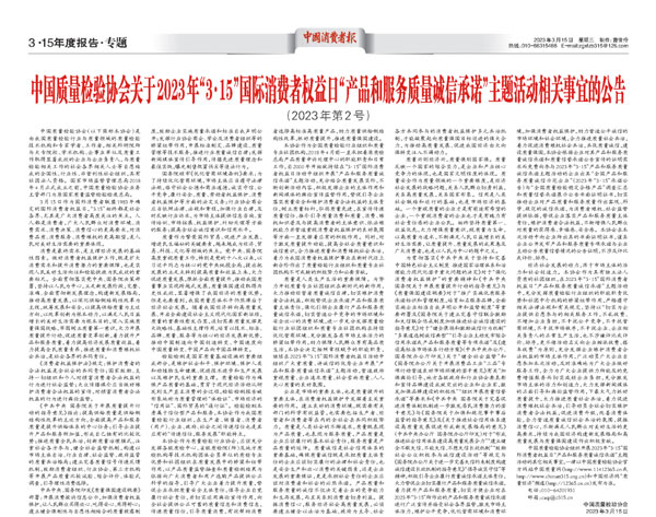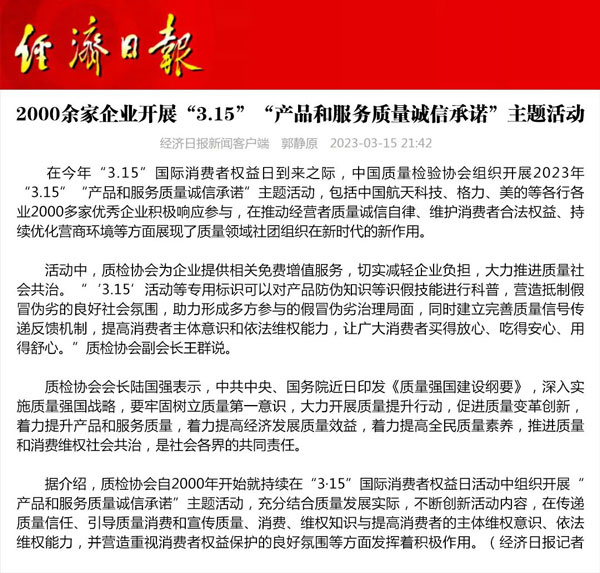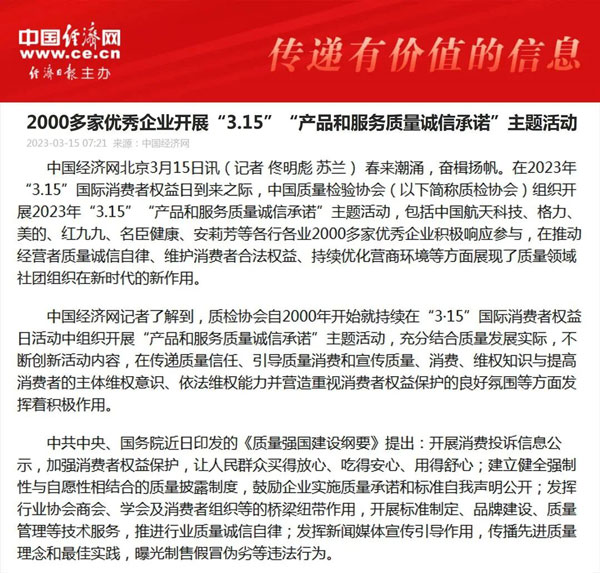 傳遞質(zhì)量信任 提振消費(fèi)信心 合力推進(jìn)高質(zhì)量發(fā)展啟新章——中國(guó)質(zhì)量檢驗(yàn)協(xié)會(huì)組織2000多家優(yōu)秀典范企業(yè)開(kāi)展“3.15”產(chǎn)品和服務(wù)質(zhì)量誠(chéng)信承諾活動(dòng)