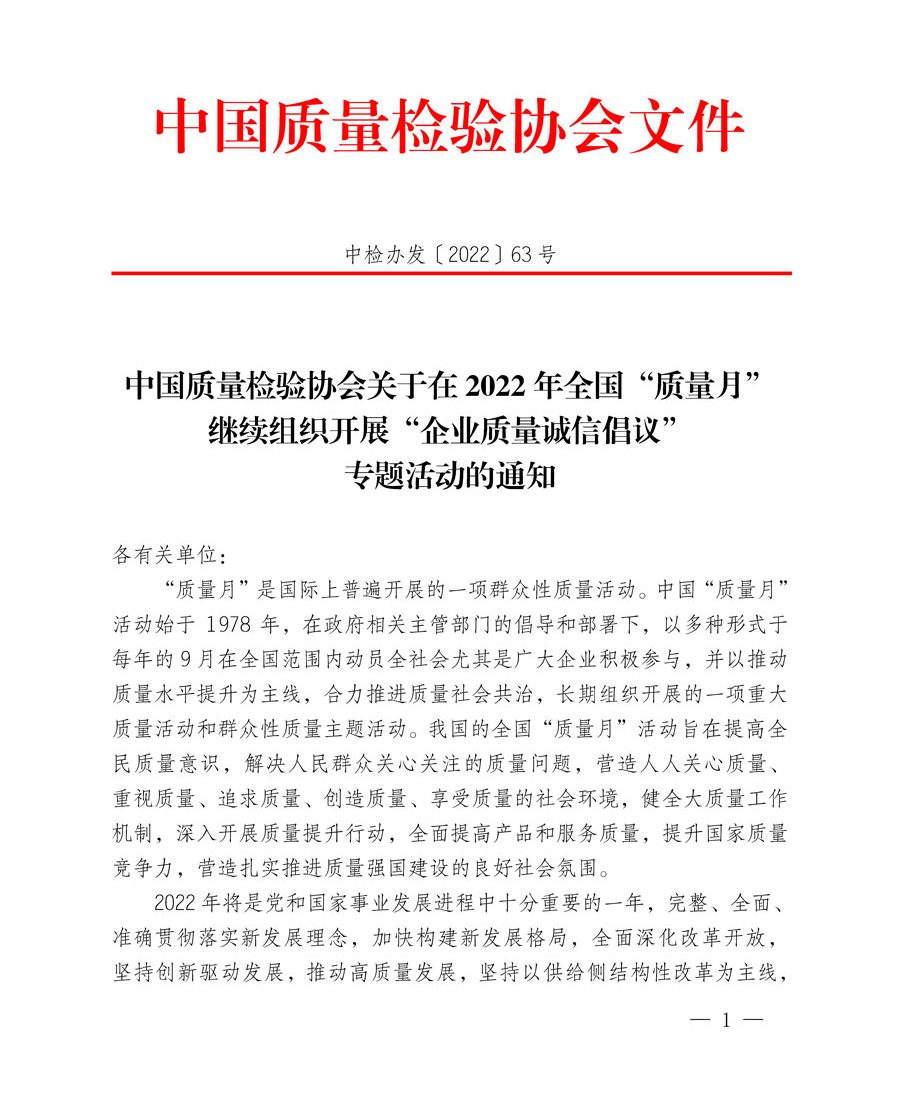 中國質(zhì)量檢驗協(xié)會作為我國質(zhì)量檢驗行業(yè)組織和質(zhì)量專業(yè)社團機構(gòu),積極響應2022年全國“質(zhì)量月”活動部署,充分發(fā)揮推動全社會質(zhì)量共治的橋梁紐帶作用,謹此組織各行各業(yè)在質(zhì)量發(fā)展、質(zhì)量提升、質(zhì)量變革、質(zhì)量創(chuàng)新、質(zhì)量誠信等方面具有良好示范作用的2000家優(yōu)秀企業(yè)共同發(fā)出《2022年全國“質(zhì)量月”企業(yè)質(zhì)量誠信倡議書》,全面樹立質(zhì)量標桿,動員廣大企業(yè)開展群眾性質(zhì)量活動,大力弘揚社會主義核心價值觀,推動形成崇尚誠信、踐行誠信的良好風尚,營造質(zhì)量誠信社會氛圍,在全社會掀起建設質(zhì)量強國的熱潮。