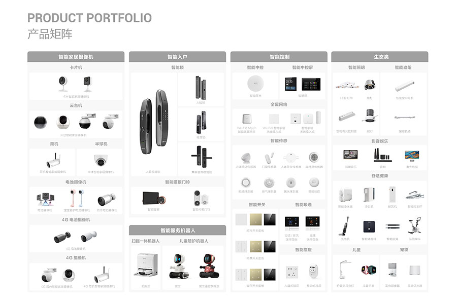 主要產(chǎn)品:螢石(EZVIZ)智能家居攝像機、智能入戶、智能服務(wù)機器人、智能控制、螢石物聯(lián)云平臺