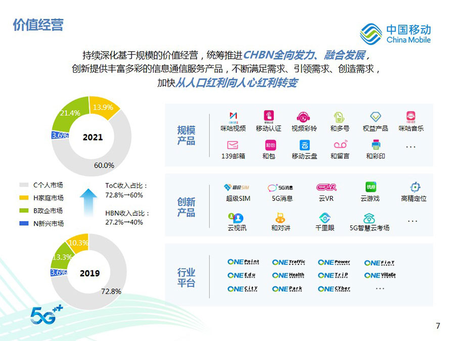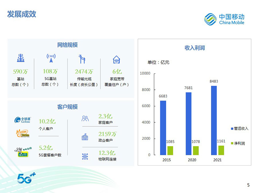 2022年,中國移動全年營運(yùn)收入達(dá)到人民幣9,373億元,同比增長10.5%,其中通信服務(wù)收入達(dá)到人民幣8,121億元,同比增長8.1%。CHBN客戶規(guī)模、收入規(guī)模全面增長,HBN收入占通信服務(wù)收入比達(dá)到39.8%,同比提升4.1個百分點。得益于5G應(yīng)用、移動云、數(shù)字內(nèi)容、智慧家庭等業(yè)務(wù)的快速拓展,數(shù)字化轉(zhuǎn)型收入達(dá)到人民幣2,076億元,同比增長30.3%。整體來看,公司著力打造的數(shù)字化轉(zhuǎn)型收入增長“第二曲線”卓有成效,收入結(jié)構(gòu)更加均衡穩(wěn)健,可持續(xù)增長動能不斷增強(qiáng),抗風(fēng)險能力顯著提升。