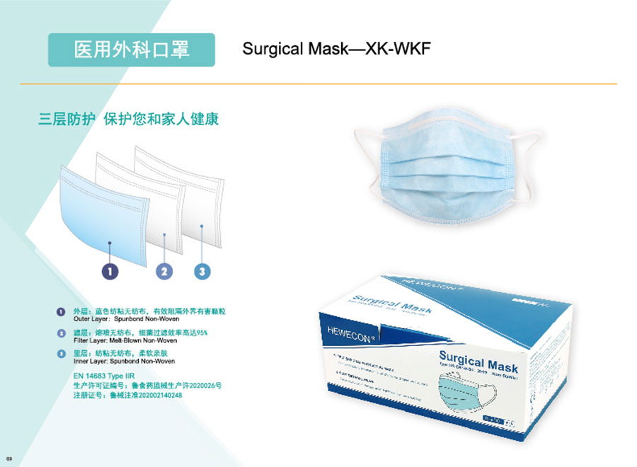 主要產(chǎn)品:海維康醫(yī)用外科口罩、醫(yī)用防護(hù)口罩、一次性無紡布口罩、KN95口罩、FFP2口罩、隔離衣、消毒濕巾