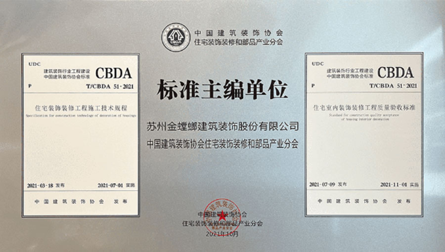 2021年,作為核心主編及實施單位參與了CBDA《住宅裝飾裝修工程施工技術(shù)規(guī)程》和CBDA《住宅室內(nèi)裝飾裝修工程施工質(zhì)量驗收標(biāo)準(zhǔn)》的制訂工作,以高標(biāo)準(zhǔn)嚴(yán)要求完成住宅裝飾行業(yè)第一部規(guī)范標(biāo)準(zhǔn)制定。