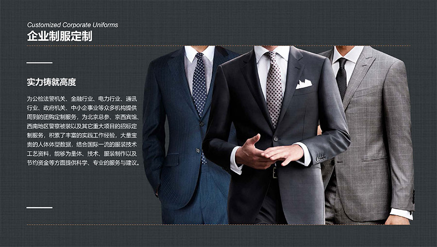 凱門品牌(KEYYMEN):高級職業(yè)裝品牌,企業(yè)形象定制專家。以精湛工藝及最優(yōu)性價比打造高品質、個性時尚的企業(yè)形象,專屬于那些為理想、為事業(yè)打拼,并在成功過程中享受生活的職場團隊及精英人士。