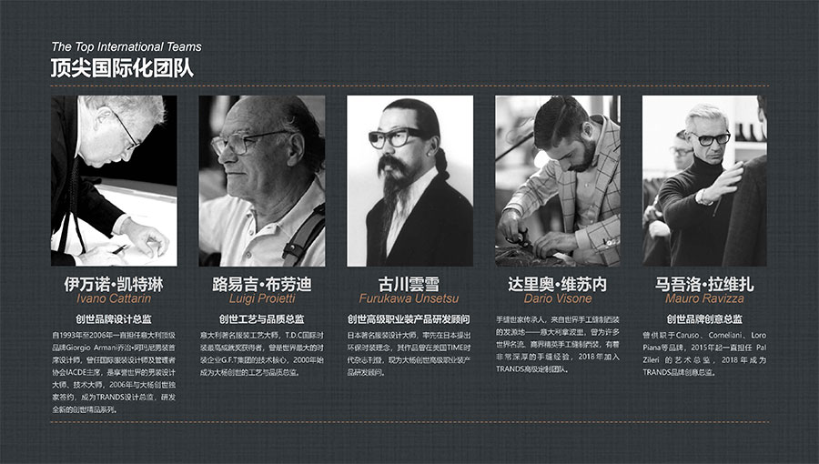 創(chuàng)世品牌(TRANDS):創(chuàng)建于1995年,是當今中國高級男裝的代表品牌之一。TRANDS創(chuàng)世成衣產品及量身定制的西裝以其至臻品質和精湛工藝,贏得眾多國際政商精英多年來的青睞。