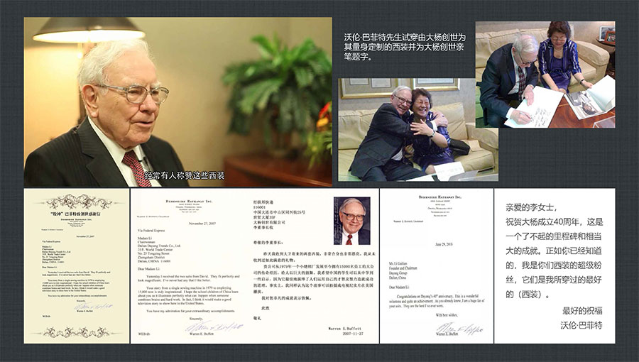大楊集團堅持做民族品牌,揚國人志氣,致力打造國際一流服裝品牌。上世紀90年代創(chuàng)立了第一個自主品牌——TRANDS(創(chuàng)世),先后榮獲“中國出口名牌”、“中國名牌產品”等稱號,并獲得中國服裝協(xié)會頒發(fā)的中國服裝品牌品質大獎,成為當今中國高級男裝的領軍品牌之一。TRANDS(創(chuàng)世)品牌申報國家非遺創(chuàng)新產品的“‘龍’金絲蘇繡中式華服”被授予十大類紡織創(chuàng)新產品。“股神”沃倫·巴菲特、微軟主席比爾·蓋茨、世界經濟論壇主席克勞斯·施瓦布等國際精英人士,均已成為品牌的忠實客戶。目前,大楊集團已形成以高級男裝品牌TRANDS(創(chuàng)世)為龍頭,團體定制高級商務裝品牌KEYMEN(凱門)、高級定制品牌凱門定制、網上直銷品牌YOUSOKU(優(yōu)·搜·酷)、學生裝品牌KEYMEN KIDS等組成的自主品牌梯隊。