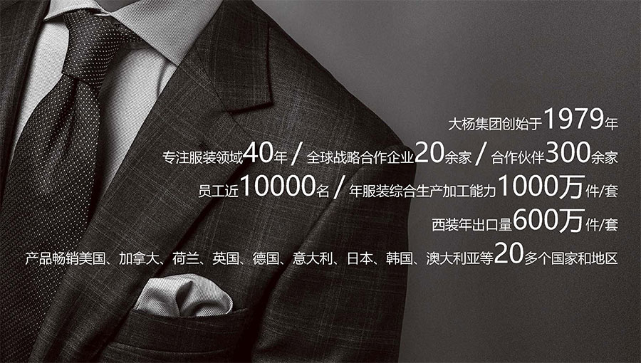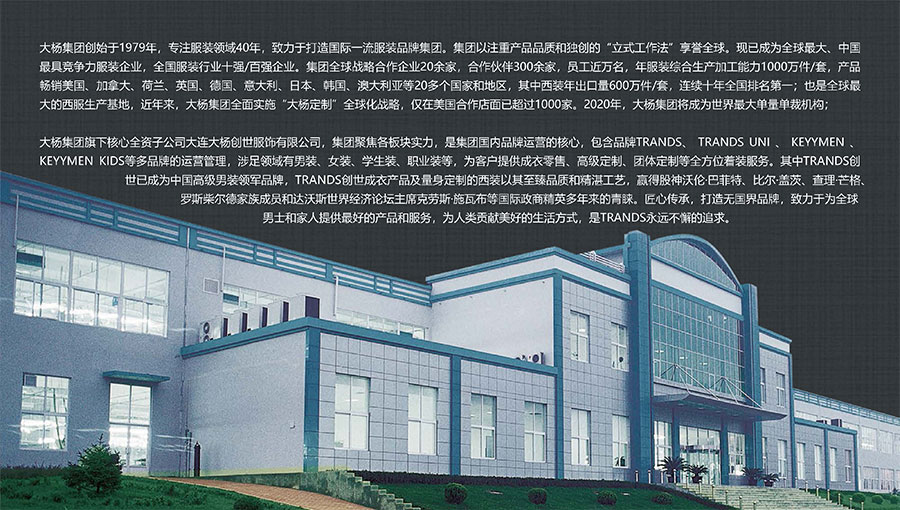 大楊集團創(chuàng)建于1979年,總部位于遼寧省大連市,主要生產和銷售各類中高檔服裝產品為主的國際化大型服裝企業(yè),以西裝縫制享譽全球,是世界重要的西裝生產加工基地?,F(xiàn)有直屬(控股)成員企業(yè)20家,員工4500人??毓勺庸敬筮B大楊創(chuàng)世股份有限公司2000年在上海證券交易所上市,并于2016年完成重大資產重組。