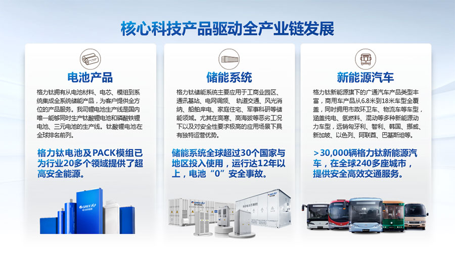 以完善的研發(fā)體系,公司加快技術(shù)創(chuàng)新與產(chǎn)業(yè)升級(jí)的步伐。公司研發(fā)的格力鈦電池安全性長(zhǎng)期領(lǐng)跑行業(yè),憑借具有高安全、大倍率、快充放、耐寬溫、長(zhǎng)壽命等特性,被選為“國(guó)家制造業(yè)單項(xiàng)冠軍產(chǎn)品”,廣泛應(yīng)用于新能源汽車以及工商業(yè)園區(qū)、通訊基站、電網(wǎng)調(diào)頻、軌道交通、風(fēng)光消納、船舶岸電、家庭住宅、軍事科研等儲(chǔ)能領(lǐng)域,具有廣闊的市場(chǎng)前景和應(yīng)用價(jià)值。目前,格力鈦儲(chǔ)能產(chǎn)品已在丹麥、瑞士、芬蘭等全球30多個(gè)國(guó)家和地區(qū)使用,新能源汽車產(chǎn)品在北京、杭州、武漢、成都、青島、哈爾濱、包頭、??诘热?40多座城市運(yùn)營(yíng),12年全球零電池事故安全運(yùn)行。
