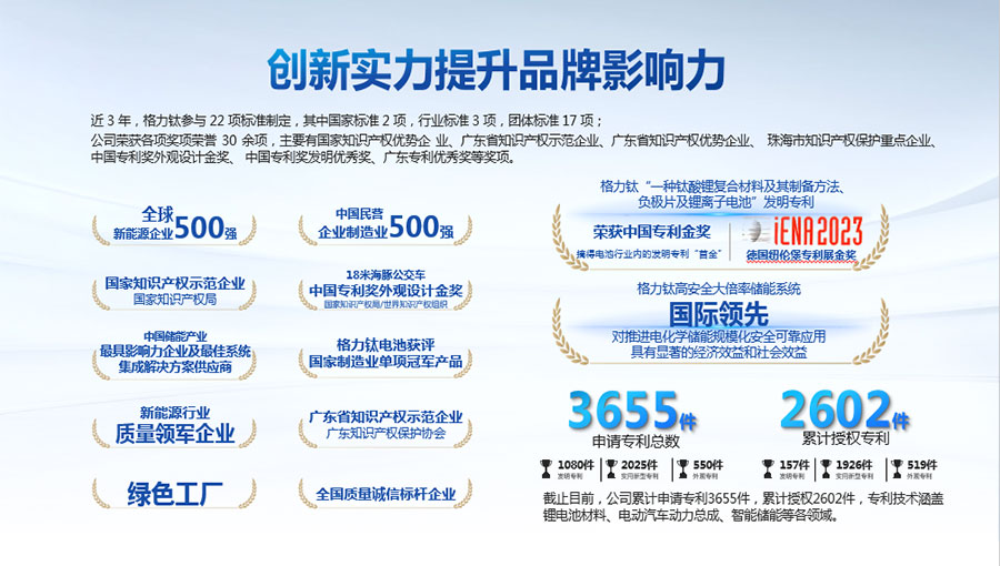 2022年,“一種鈦酸鋰復(fù)合材料及其制備方法、負(fù)極片及鋰離子電池”發(fā)明專利獲得中國(guó)專利金獎(jiǎng),摘得鋰電池行業(yè)內(nèi)的發(fā)明專利“首金”;2023年,該專利技術(shù)再次斬獲第75屆德國(guó)紐倫堡發(fā)明國(guó)際金獎(jiǎng)。“高安全大倍率儲(chǔ)能系統(tǒng)關(guān)鍵技術(shù)研發(fā)與應(yīng)用”項(xiàng)目被中國(guó)機(jī)械工業(yè)聯(lián)合會(huì)鑒定達(dá)到“國(guó)際領(lǐng)先”水平。截止目前,公司先后獲得“中國(guó)民營(yíng)企業(yè)制造業(yè)500強(qiáng)”、“全國(guó)質(zhì)量信得過(guò)產(chǎn)品”、“客車安全技術(shù)成果獎(jiǎng)”、“中國(guó)儲(chǔ)能產(chǎn)業(yè)最具影響力企業(yè)獎(jiǎng)、最佳系統(tǒng)集成商、最佳儲(chǔ)能電池供應(yīng)商”等榮譽(yù),獲得工信部頒發(fā)的“綠色工廠”榮譽(yù)稱號(hào);上榜科技部發(fā)布的新能源領(lǐng)域獨(dú)角獸企業(yè),多年入選全球新能源企業(yè)500強(qiáng),入選“全國(guó)百佳質(zhì)量檢驗(yàn)誠(chéng)信標(biāo)桿企業(yè)”、“國(guó)家知識(shí)產(chǎn)權(quán)優(yōu)勢(shì)企業(yè)”等。