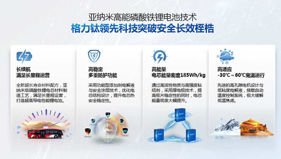 鈦酸鋰電池技術(shù)是新能源行業(yè)唯一獲得中國(guó)專利獎(jiǎng)金獎(jiǎng)的鋰電池產(chǎn)品技術(shù),其應(yīng)用于儲(chǔ)能電池和動(dòng)力電池具有超高安全性,在快充放、耐寬溫、長(zhǎng)壽命等方面同樣具有卓越的性能。格力鈦電池系列產(chǎn)品具有不起火不爆炸高安全、6分鐘快充放、-50℃至60℃耐寬溫特性,循環(huán)充放電次數(shù)高達(dá)30000多次,使用壽命長(zhǎng)達(dá)30年。格力鈦電池經(jīng)利鋸切割、尖針穿刺、強(qiáng)力擠壓、電鉆沖孔、短路充放電、高溫加熱、槍擊等極限條件測(cè)試,均未發(fā)生冒煙、起火、燃燒、爆炸等現(xiàn)象。