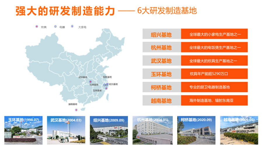 浙江蘇泊爾股份有限公司是中國最大、全球第二的炊具研發(fā)制造商之一,中國廚房小家電領(lǐng)先品牌。在杭州、玉環(huán)、紹興、武漢和越南建立了5大研發(fā)制造基地,擁有1萬多名員工。蘇泊爾是中國炊具行業(yè)首家上市公司(股票代碼002032)。浙江蘇泊爾家電制造有限公司是浙江蘇泊爾股份有限公司的控股子公司,注冊資本13369萬元,自2004年1月成立,主要生產(chǎn)電飯煲、電蒸鍋、電燉鍋、煎烤器等廚房小家電產(chǎn)品。2023年營收達到40.83億元,擁有2100多名員工,目前為中國最大的電飯煲生產(chǎn)基地之一。