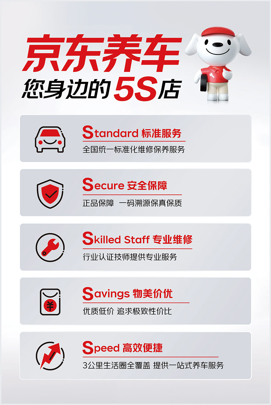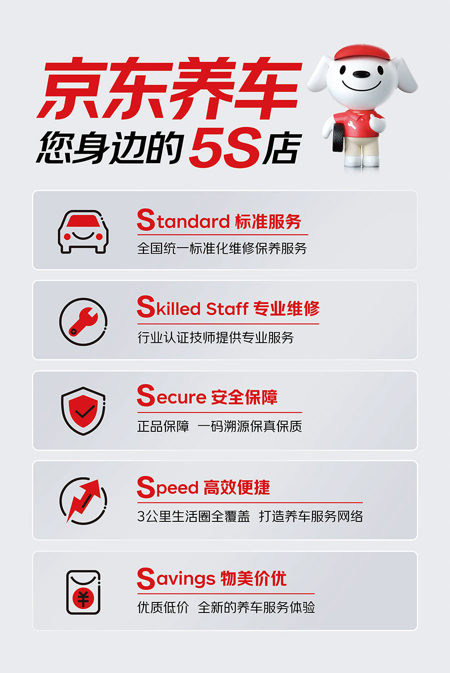 在養(yǎng)車(chē)標(biāo)準(zhǔn)方面京東養(yǎng)車(chē)秉承有保障、更專(zhuān)業(yè)的品牌服務(wù)理念,推出全新5S服務(wù)標(biāo)準(zhǔn)。從多個(gè)維度保障客戶(hù)權(quán)益,提升服務(wù)品質(zhì)。