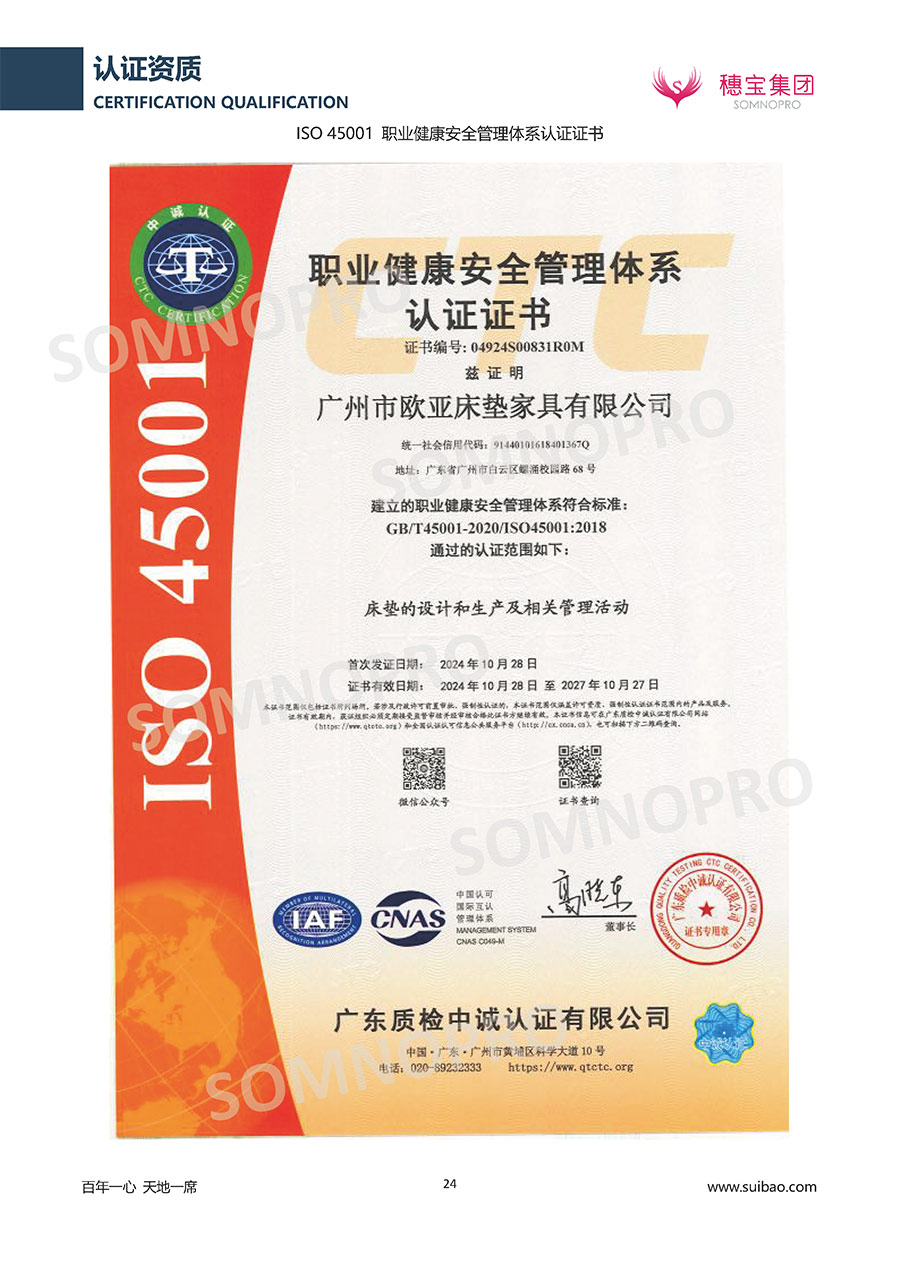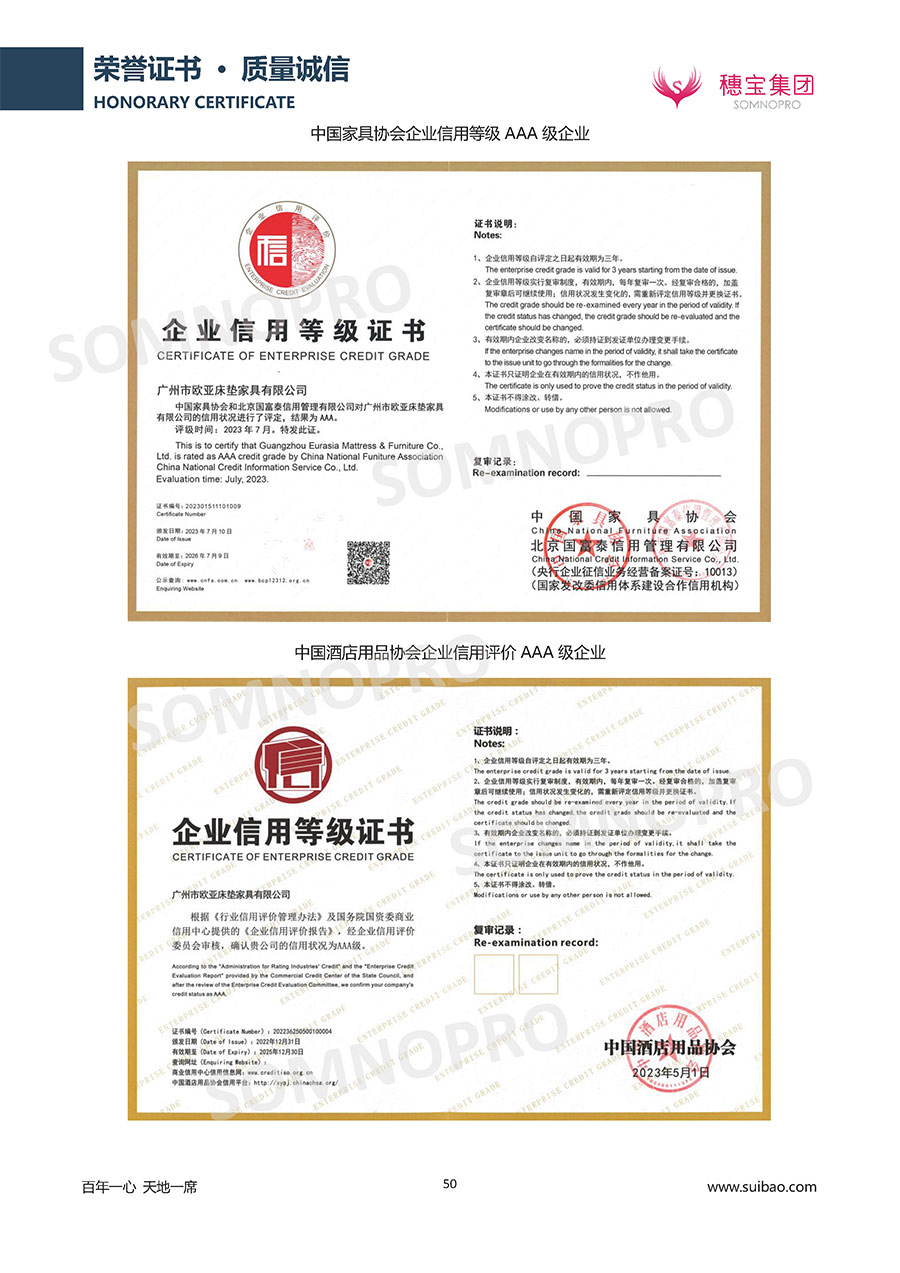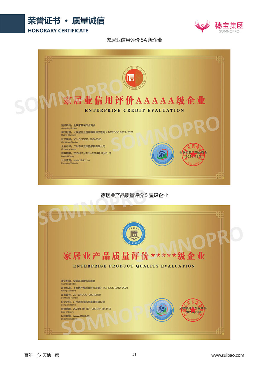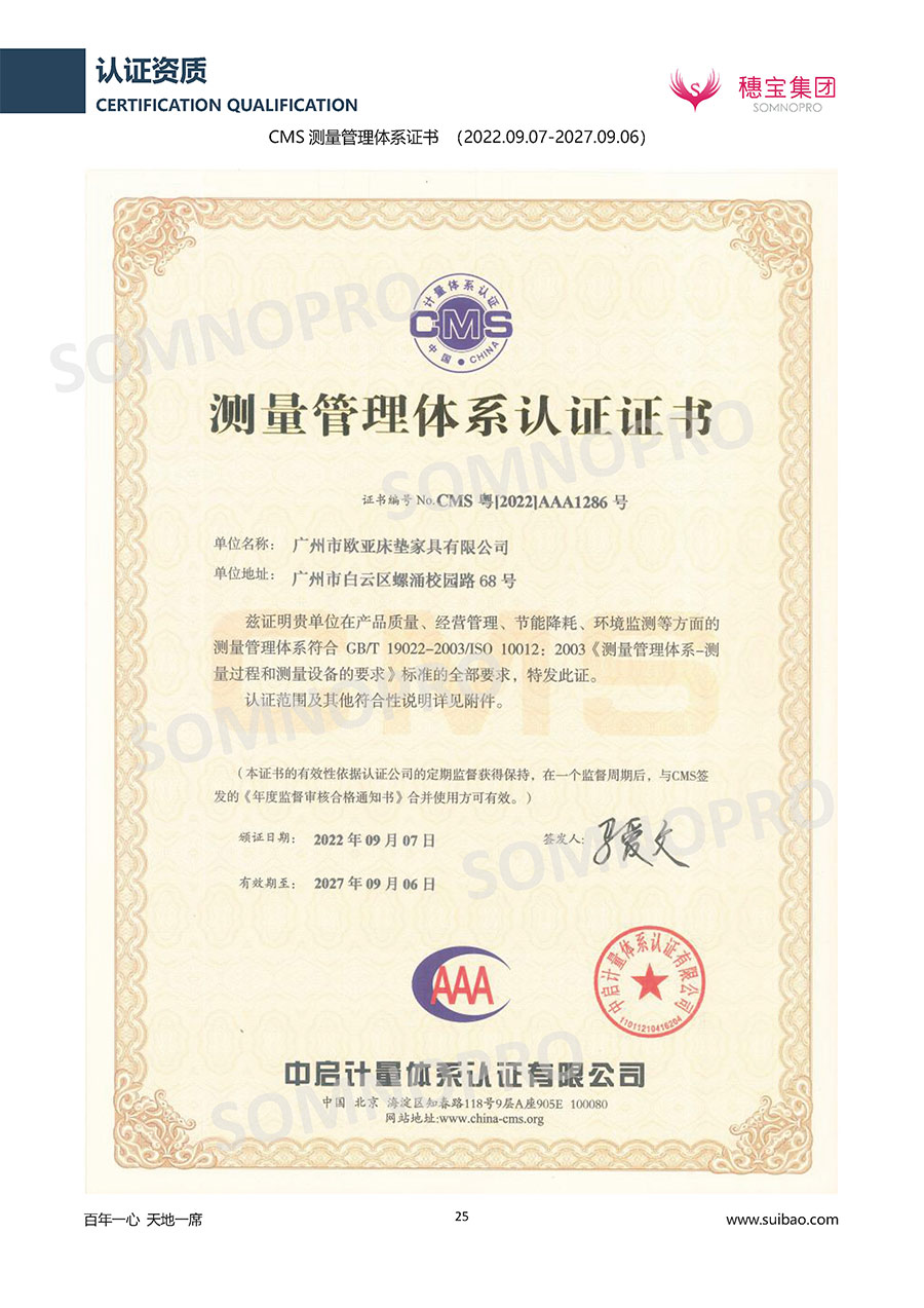 本著高品質(zhì)、高效率、重管理的原則,穗寶已通過ISO9001質(zhì)量管理體系認證證書、ISO14001環(huán)境管理體系認證證書、ISO45001職業(yè)健康安全管理體系認證證書、中國環(huán)境標(biāo)志產(chǎn)品認證證書、家居綠色環(huán)保領(lǐng)跑品牌、綠色正品家居品牌、企業(yè)標(biāo)準“綠色領(lǐng)跑者”證書、CMS測量管理體系證書、CMS測量管理體系證書附件、廣東省“守信用重合同”企業(yè)、廣州歐亞-納稅信用A級納稅人(連續(xù)5年:2018-2022)、2024年中國500最具價值品牌,品牌價值高達302.89億元、廣東高價值商標(biāo)品牌(穗寶)、廣東省重點商標(biāo)保護名錄納入證明、廣州市勞動關(guān)系和諧企業(yè)AA級。穗寶自創(chuàng)立以來,不斷致力于新產(chǎn)品的設(shè)計與研發(fā),多次在國內(nèi)家具展會屢獲獎項,產(chǎn)品暢銷國內(nèi)外,深受客戶一致好評。