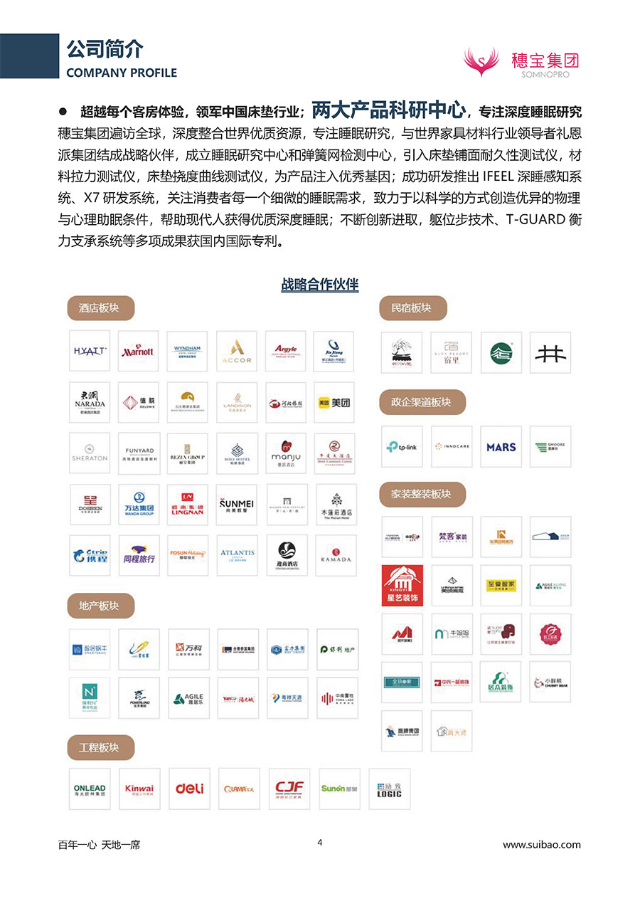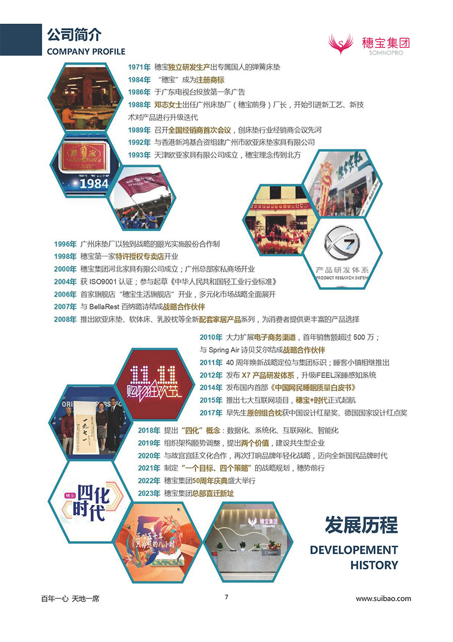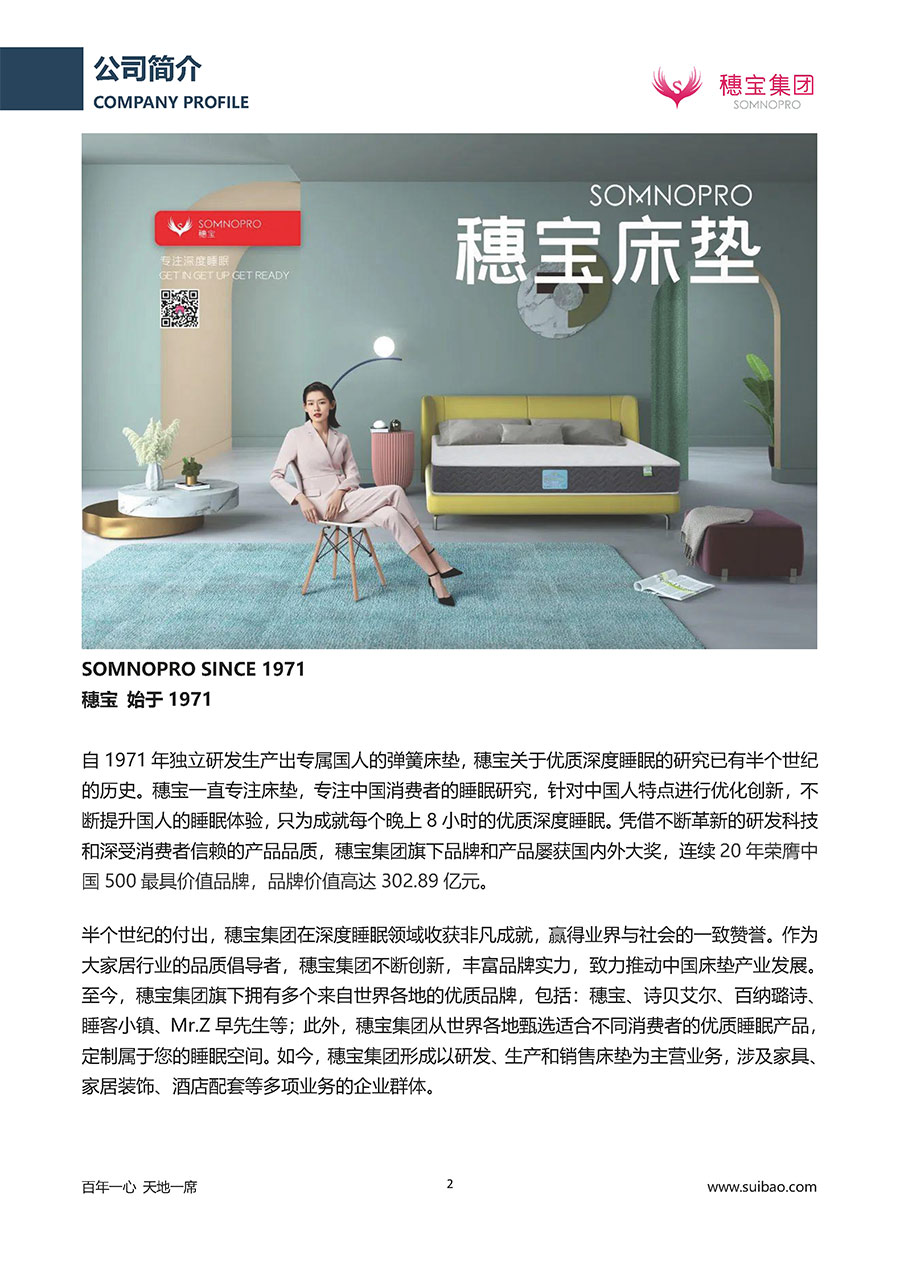 半個世紀的付出,穗寶集團在深度睡眠領(lǐng)域收獲非凡成就,贏得業(yè)界與社會的一致贊譽。作為大家居行業(yè)的品質(zhì)倡導(dǎo)者,穗寶集團不斷創(chuàng)新,豐富品牌實力,致力推動中國床墊產(chǎn)業(yè)發(fā)展。至今,穗寶集團旗下?lián)碛卸鄠€來自世界各地的優(yōu)質(zhì)品牌,包括:穗寶、詩貝艾爾、百納璐詩、睡客小鎮(zhèn)、Mr.Z早先生等;此外,穗寶集團從世界各地甄選適合不同消費者的優(yōu)質(zhì)睡眠產(chǎn)品,定制屬于您的睡眠空間。如今,穗寶集團形成以研發(fā)、生產(chǎn)和銷售床墊為主營業(yè)務(wù),涉及家具、家居裝飾、酒店配套等多項業(yè)務(wù)的企業(yè)群體。