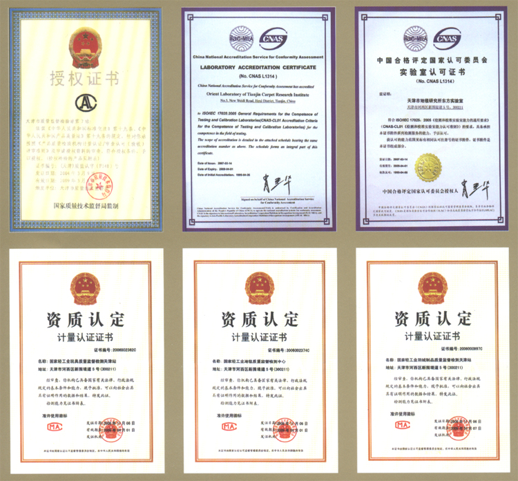 國(guó)家地毯質(zhì)量監(jiān)督檢驗(yàn)中心籌建于1987年,于1988年、1991年相繼通過(guò)了國(guó)家技術(shù)監(jiān)督局的計(jì)量認(rèn)證考核和審查認(rèn)可,是國(guó)家技術(shù)監(jiān)督局依法授權(quán)的國(guó)家級(jí)產(chǎn)品質(zhì)量監(jiān)督檢驗(yàn)機(jī)構(gòu)。1999年、2003年和2006年又相繼通過(guò)了CNACL、CNAL和CNAS中國(guó)合格評(píng)定國(guó)家認(rèn)可委員會(huì)和國(guó)家認(rèn)證認(rèn)可監(jiān)督管理委員會(huì)對(duì)實(shí)驗(yàn)室資格“三合一”的復(fù)查認(rèn)可和授權(quán)。