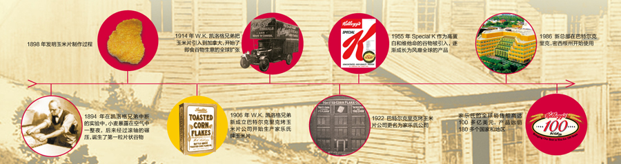 一百多年來,家樂氏公司秉承“更健康、更營養(yǎng)美味和更高質量”的信念以及“天然和優(yōu)質”的高尚品質,不斷地推陳出新,先后推出系列經典 產品如All-Bran®(1916年)和 Rice Krispies®(1928年)。隨著業(yè)務的發(fā)展,家樂氏公司開始拓展國際業(yè)務:1914年Kellogg’s Corn Flakes®產品進軍加拿大市場,1924年和1938年分別在澳大利亞的悉尼、英格蘭的曼徹斯特設立工廠。2007年,家樂氏成功進入中國,并以銷售額接近120億美金的業(yè)績成為全球谷物食品和方便食品的領頭者,產品包括谷物類早餐、餅干、克力架、糕點、果味小食、燕麥餅干棒、冷凍華夫以及素食產品等。2012年6月,家樂氏在全球成功收購品客品牌,使家樂氏的休閑產品成為繼谷物產品之后的第二大品牌。