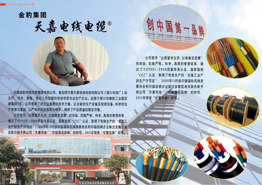 公司信守“以質(zhì)量求生存,以信譽(yù)求發(fā)展”的宗旨,實(shí)施嚴(yán)格、科學(xué)、高效的管理體系,通過(guò)了ISO9001:2008質(zhì)量體系認(rèn)證,國(guó)家強(qiáng)制“CCC”認(rèn)證,取得了電纜生產(chǎn)的“全國(guó)工業(yè)產(chǎn)品生產(chǎn)許可證”,2009年由中國(guó)國(guó)際名牌發(fā)展協(xié)會(huì)和中國(guó)品牌企業(yè)聯(lián)合發(fā)展促進(jìn)會(huì)聯(lián)合授予公司“天嘉電線®”“中國(guó)著名品牌”的稱號(hào),2011年榮獲“寧夏名牌”稱號(hào)。公司是寧夏質(zhì)量管理協(xié)會(huì)副會(huì)長(zhǎng)單位、銀川市質(zhì)量管理協(xié)會(huì)理事單位、賀蘭縣質(zhì)量管理協(xié)會(huì)理事單位、中國(guó)電器工業(yè)協(xié)會(huì)電線電纜分會(huì)會(huì)員單位。
