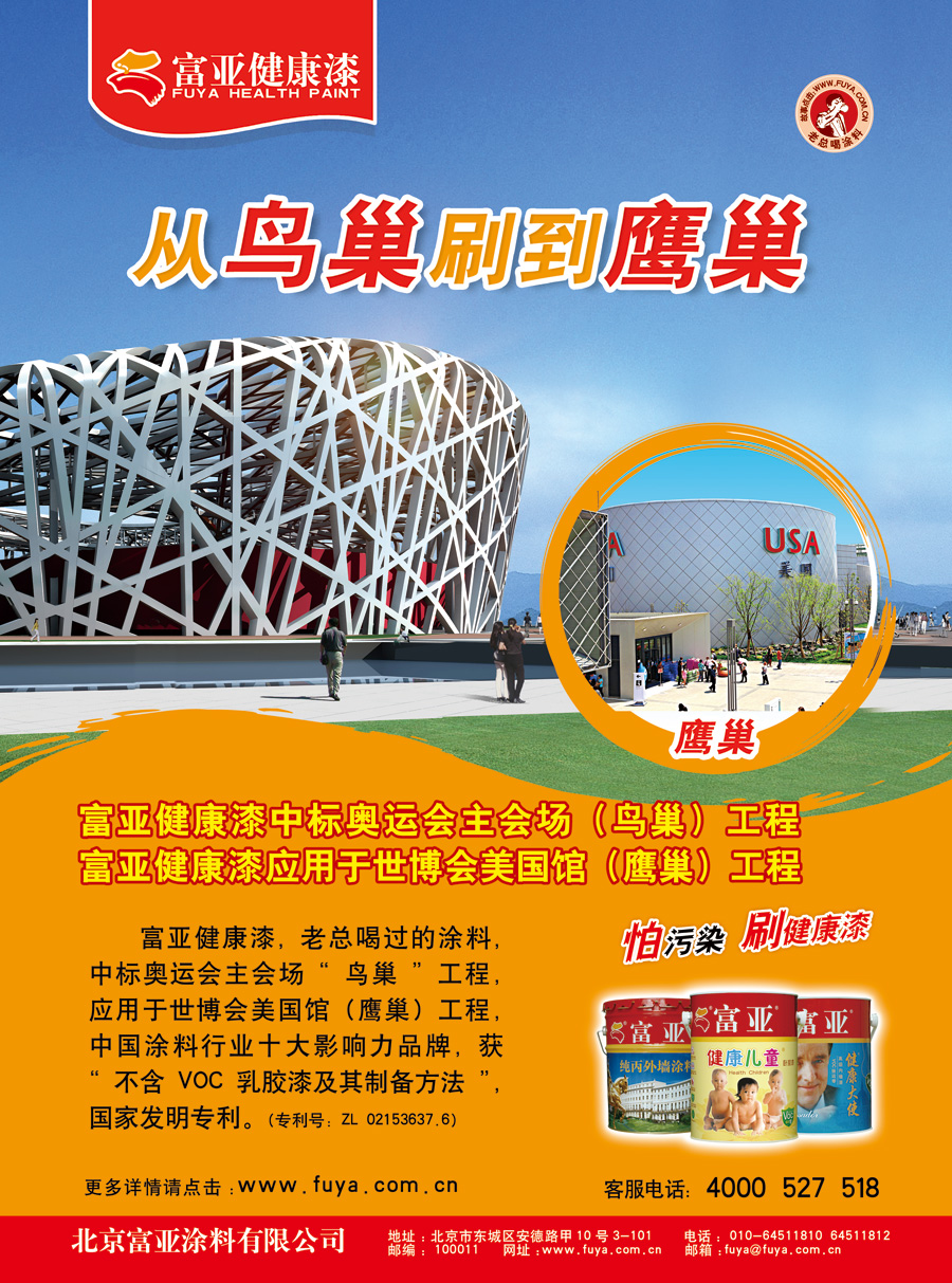 富亞涂料公司擁有多項國家專利,具有資深科研背景,與國內(nèi)各大科研院所、大學建有密切的合作關(guān)系,對于富亞企業(yè)的科技進步,起到了強有力的支持作用。富亞涂料公司作為行業(yè)權(quán)威參與國家標準、行業(yè)標準的制定,為促進行業(yè)發(fā)展貢獻了自己的力量。憑借企業(yè)強大的科研實力和雄厚的資金,富亞在環(huán)保與健康這個定位上,集中優(yōu)勢資源,一舉突破并實現(xiàn)VOC≈0的超級健康產(chǎn)品,實現(xiàn)了人類對健康乳膠漆的理想追求。2007年富亞產(chǎn)品一舉中標奧運會“鳥巢”裝飾工程;2011年富亞公司榮獲了北京市工商行政管理局頒發(fā)的2010年度“北京市著名商標”榮譽證書;2012年,富亞健康漆入選商務部《對外援助成套項目主要設(shè)備材料產(chǎn)品目錄》。