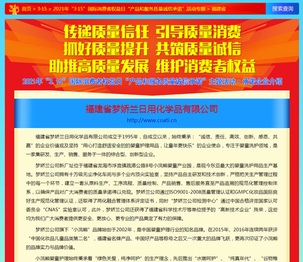引導(dǎo)質(zhì)量消費(fèi),共筑質(zhì)量誠信,3月15日,由中國質(zhì)量檢驗(yàn)協(xié)會主辦的2021年“3.15”產(chǎn)品和服務(wù)質(zhì)量誠信承諾的主題活動如期舉行,小浣熊作為“3.15”產(chǎn)品和服務(wù)質(zhì)量誠信承諾企業(yè),憑借匠心的品質(zhì)、優(yōu)質(zhì)的服務(wù)及良好的口碑,獲得協(xié)會以及權(quán)威專家的一致認(rèn)可,榮獲“全國產(chǎn)品和服務(wù)質(zhì)量誠信示范企業(yè)”,“全國質(zhì)量誠信先進(jìn)企業(yè)”、“全國質(zhì)量信譽(yù)保障產(chǎn)品”、“全國日化行業(yè)質(zhì)量領(lǐng)先品牌” 等多項(xiàng)榮譽(yù),《中國質(zhì)量報(bào)》、《中國消費(fèi)者報(bào)》及中國質(zhì)量網(wǎng)、中國經(jīng)濟(jì)網(wǎng)、中國消費(fèi)網(wǎng)等多家媒體均予以集中展示和公告。