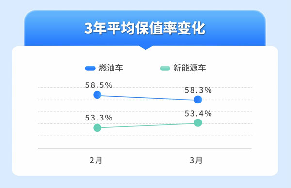 3月,3年平均保值率,燃油車向下,新能源車向上