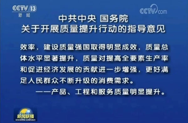 2017年9月5日,我國質(zhì)量發(fā)展史上首個(gè)以黨中央、國務(wù)院名義出臺的質(zhì)量工作綱領(lǐng)性文件——《中共中央國務(wù)院關(guān)于開展質(zhì)量提升行動(dòng)的指導(dǎo)意見》。