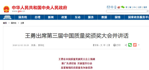 11月2日,第三屆中國質(zhì)量獎(jiǎng)?lì)C獎(jiǎng)大會在京召開。