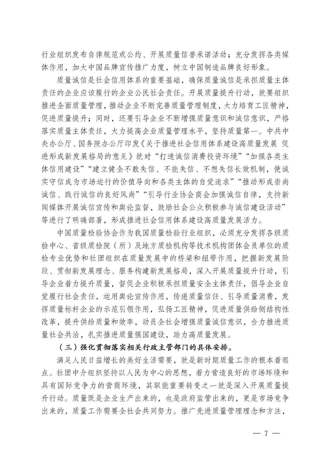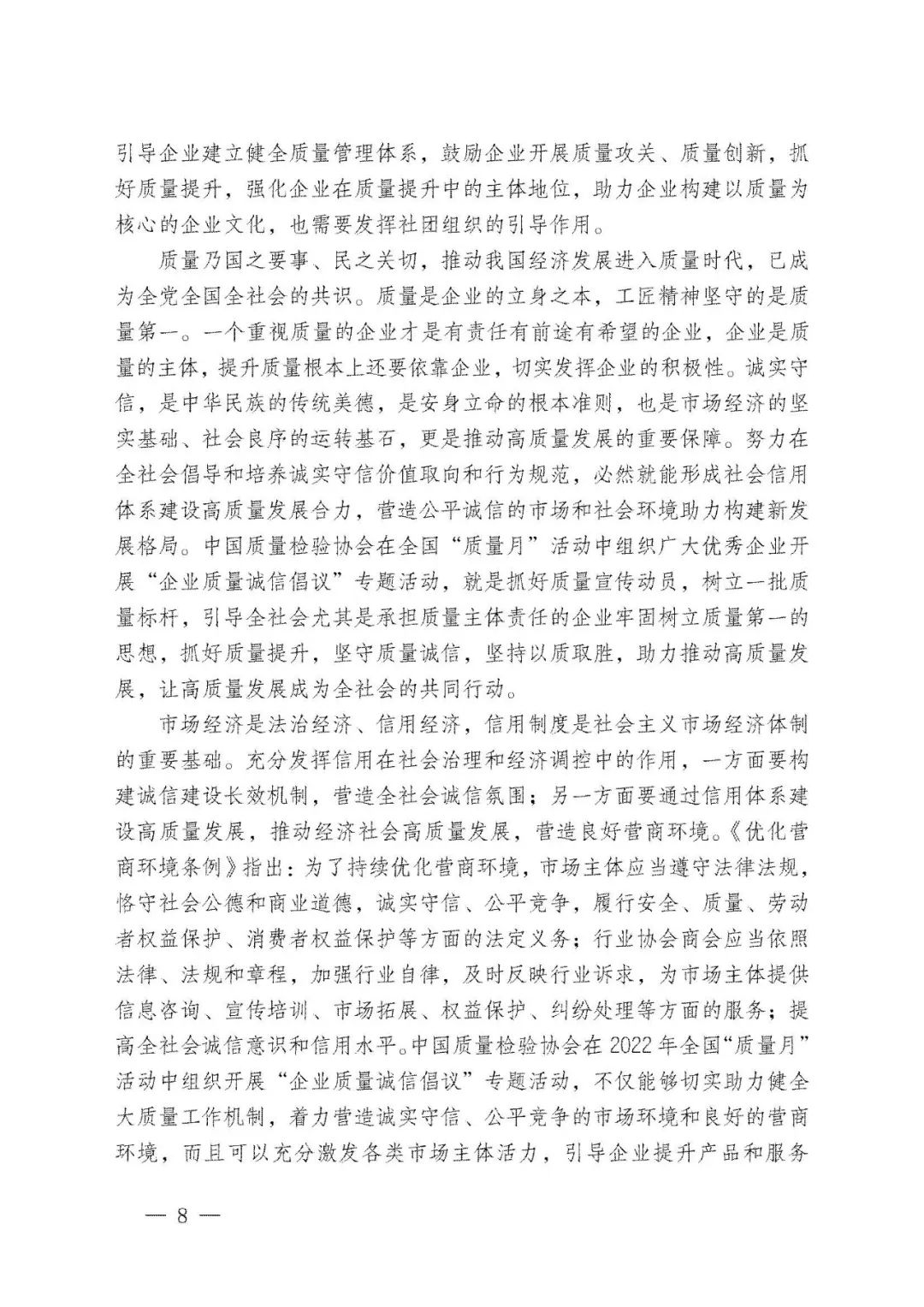李克強(qiáng)總理批示指出,打造集質(zhì)量、標(biāo)準(zhǔn)、技術(shù)、品牌等于一體的高品質(zhì)產(chǎn)品和服務(wù),在市場競爭中鍛就中國質(zhì)量、培育中國精品。倡導(dǎo)企業(yè)對產(chǎn)品和服務(wù)質(zhì)量作出誠信倡議,也是中國質(zhì)量檢驗(yàn)協(xié)會自2004年以來組織開展全國“質(zhì)量月”企業(yè)質(zhì)量誠信倡議專題活動的要義。謹(jǐn)期社會各界共同努力,推進(jìn)質(zhì)量社會共治,抓好產(chǎn)品和服務(wù)的高品質(zhì)質(zhì)量提升,共同為我們的質(zhì)量強(qiáng)國事業(yè)去奮斗!