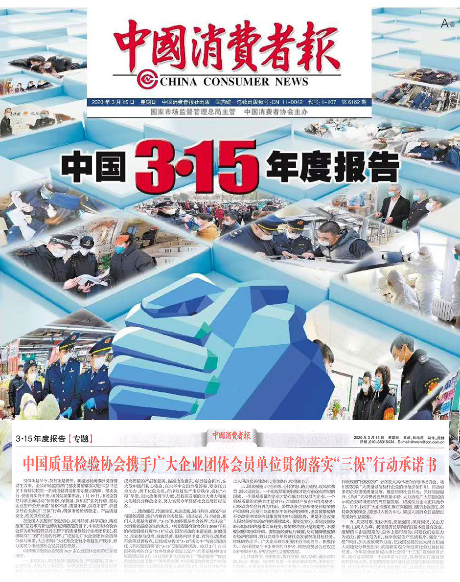 中國質(zhì)量報《不忘初心 勇毅擔當 守望相助 傳遞信任——中國質(zhì)量檢驗協(xié)會攜手廣大會員企業(yè)響應(yīng)“三保”行動并組織開展2020年“3·15”產(chǎn)品和服務(wù)質(zhì)量誠信活動》