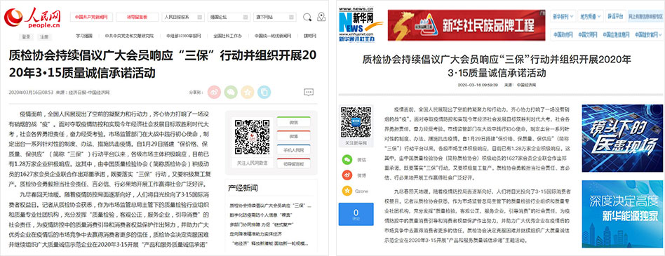 人民網(wǎng)《質(zhì)檢協(xié)會持續(xù)倡議廣大會員響應(yīng)“三?!毙袆硬⒔M織開展2020年3·15質(zhì)量誠信承諾活動》