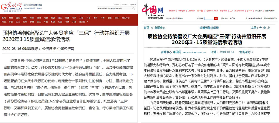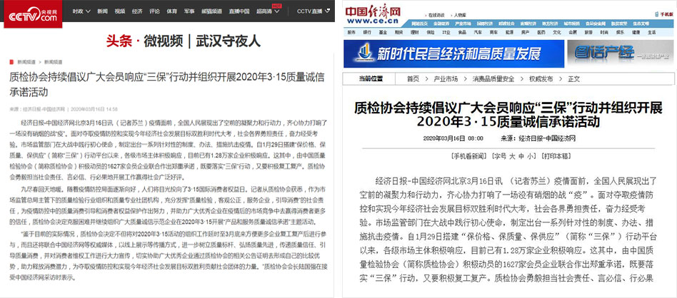 中國經(jīng)濟網(wǎng)《質(zhì)檢協(xié)會持續(xù)倡議廣大會員響應(yīng)“三保”行動并組織開展2020年3·15質(zhì)量誠信承諾活動》