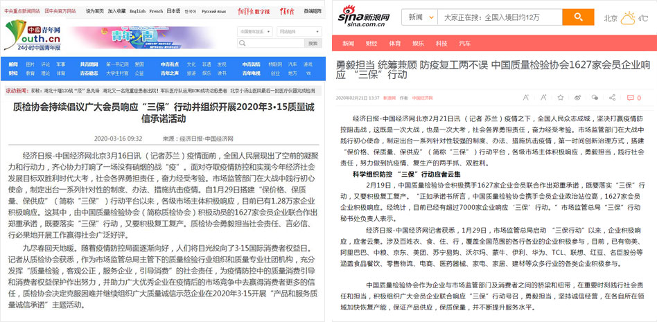 新浪網(wǎng)《勇毅擔當 統(tǒng)籌兼顧 防疫復(fù)工兩不誤 中國質(zhì)量檢驗協(xié)會1627家會員企業(yè)響應(yīng) “三保”行動》