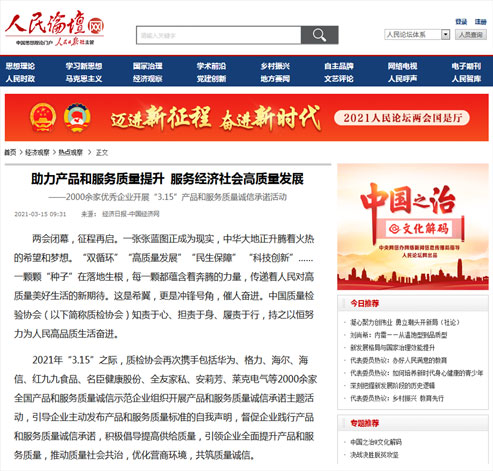 人民論壇網(wǎng):助力產(chǎn)品和服務(wù)質(zhì)量提升 服務(wù)經(jīng)濟(jì)社會(huì)高質(zhì)量發(fā)展——2000余家優(yōu)秀企業(yè)開展“3.15”產(chǎn)品和服務(wù)質(zhì)量誠信承諾活動(dòng)
