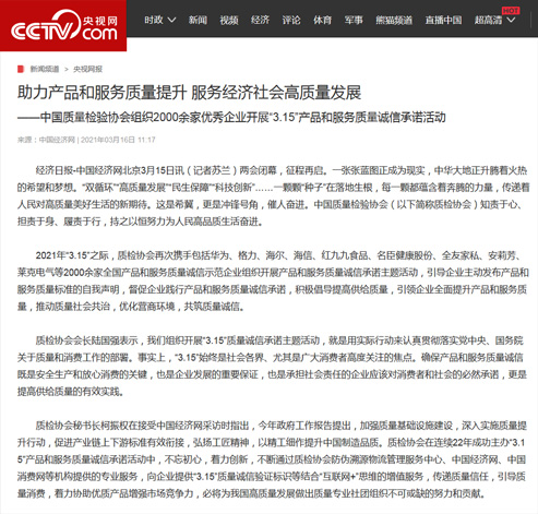 中國經(jīng)濟(jì)網(wǎng):傳遞質(zhì)量信任、引導(dǎo)質(zhì)量消費(fèi),我們堅(jiān)持在行動(dòng)!——中國質(zhì)量檢驗(yàn)協(xié)會(huì)組織2000余家優(yōu)秀企業(yè)在2021年“3.15”開展產(chǎn)品和服務(wù)質(zhì)量誠信承諾主題活動(dòng)