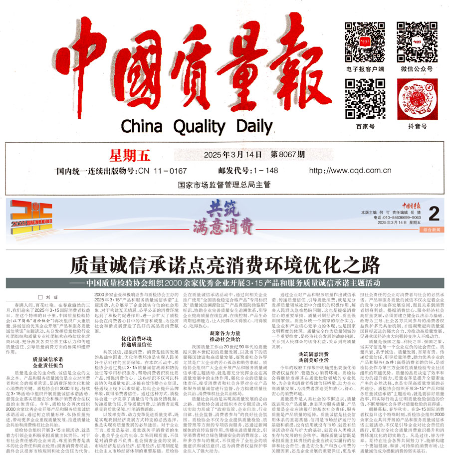 《中國質(zhì)量報》(2025年3月14日刊)發(fā)布:中國質(zhì)量檢驗協(xié)會關(guān)于組織開展2025年“3·15”國際消費者權(quán)益日“產(chǎn)品和服務(wù)質(zhì)量誠信承諾”主題活動的公告(2025年第6號)