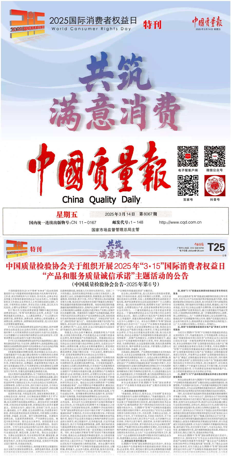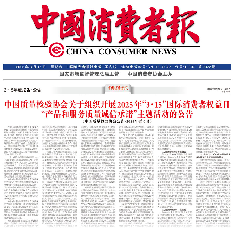 《中國消費者報》(2025年3月15日刊)發(fā)布:中國質(zhì)量檢驗協(xié)會關(guān)于組織開展2025年“3·15”國際消費者權(quán)益日“產(chǎn)品和服務(wù)質(zhì)量誠信承諾”主題活動的公告(2025年第6號)
