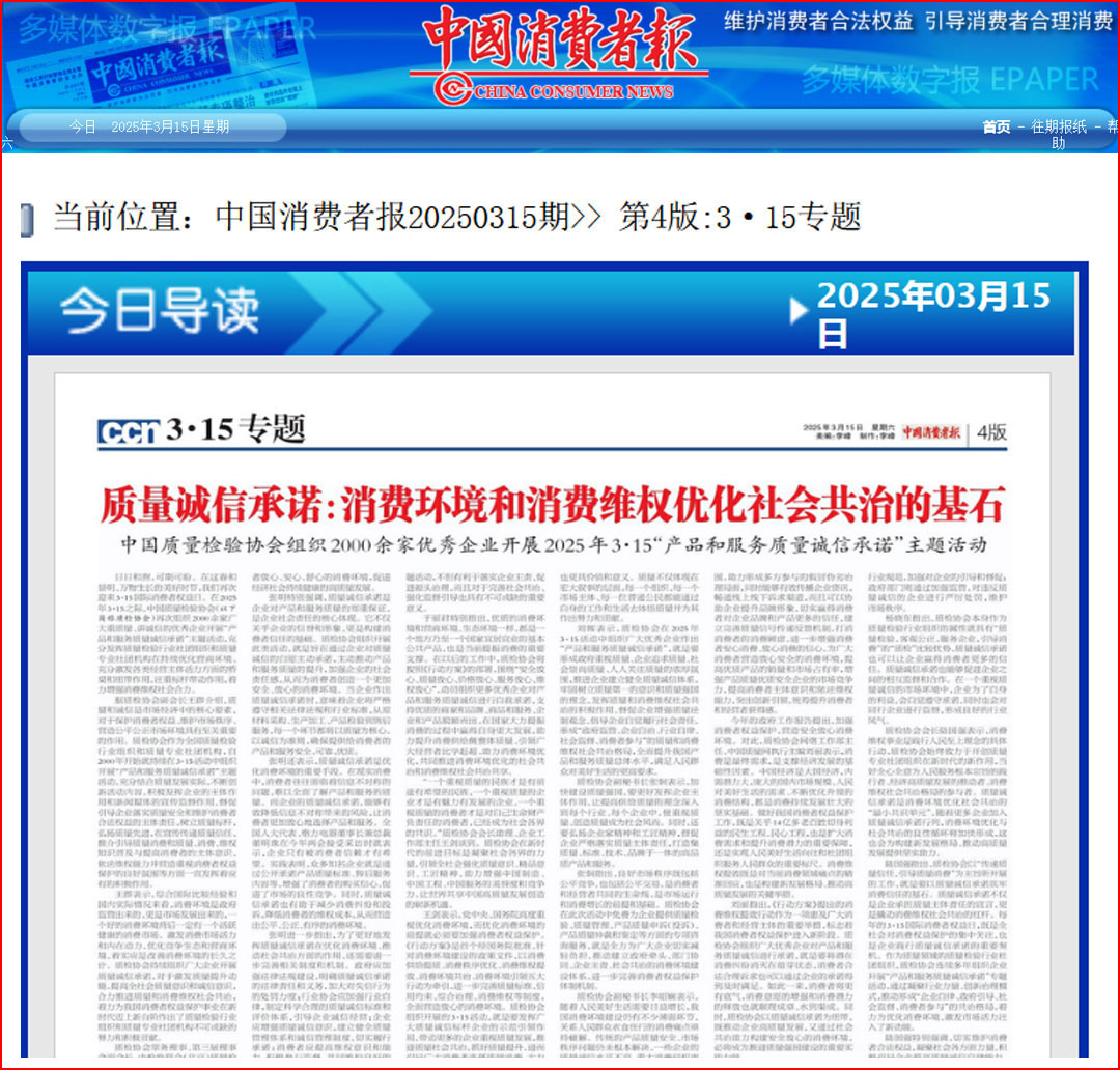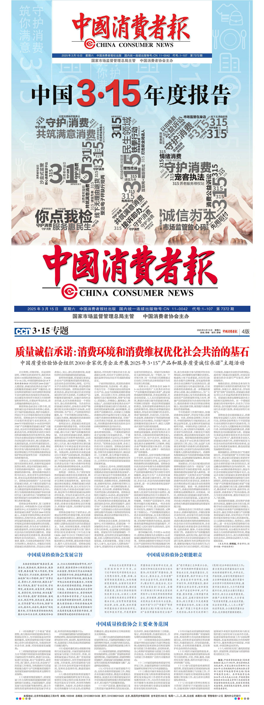 《中國消費者報》(2025年3月15日刊)發(fā)布:質(zhì)量誠信承諾:消費環(huán)境和消費維權(quán)優(yōu)化社會共治的基石——中國質(zhì)量檢驗協(xié)會組織2000余家優(yōu)秀企業(yè)開展2025年3·15“產(chǎn)品和服務(wù)質(zhì)量誠信承諾”主題活動