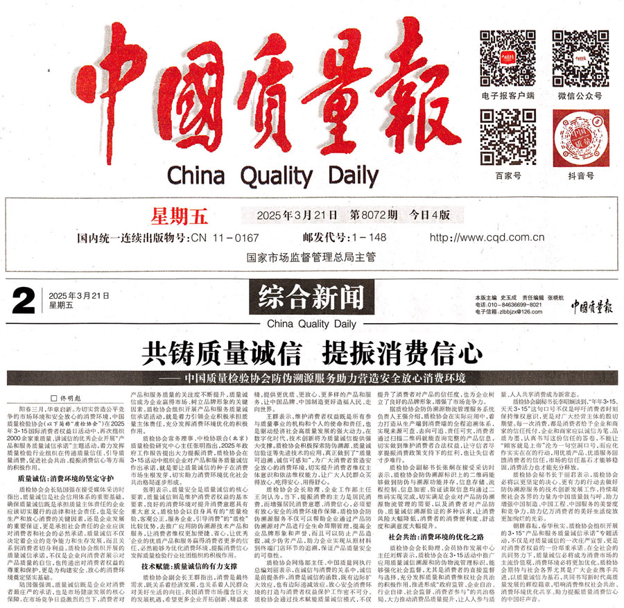 《中國質(zhì)量報》(2025年3月21日刊)發(fā)布:共鑄質(zhì)量誠信 提振消費信心——中國質(zhì)量檢驗協(xié)會防偽溯源服務(wù)助力營造安全放心消費環(huán)境