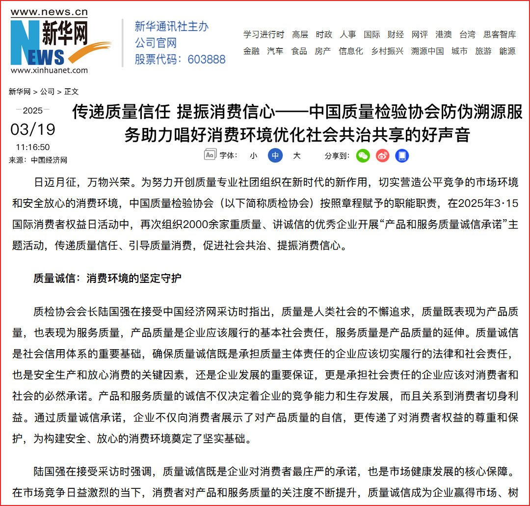 中金在線報道:質(zhì)量誠信承諾助力消費環(huán)境優(yōu)化社會共治——中國質(zhì)量檢驗協(xié)會組織2025年3·15“產(chǎn)品和服務(wù)質(zhì)量誠信承諾”主題活動