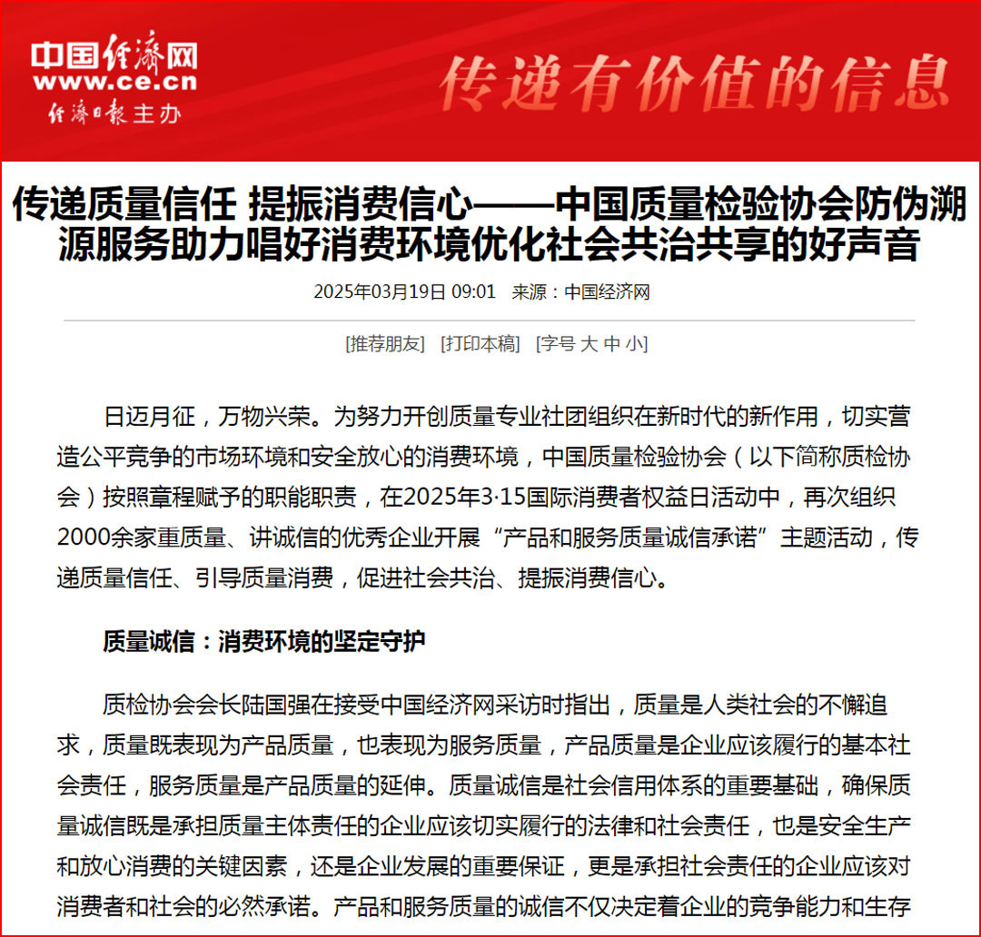 中國經(jīng)濟網(wǎng)“質(zhì)量經(jīng)濟頻道”發(fā)布:質(zhì)量誠信承諾:消費環(huán)境和消費維權(quán)優(yōu)化社會共治的基石——中國質(zhì)量檢驗協(xié)會組織2000余家優(yōu)秀企業(yè)開展2025年3·15“產(chǎn)品和服務(wù)質(zhì)量誠信承諾”主題活動