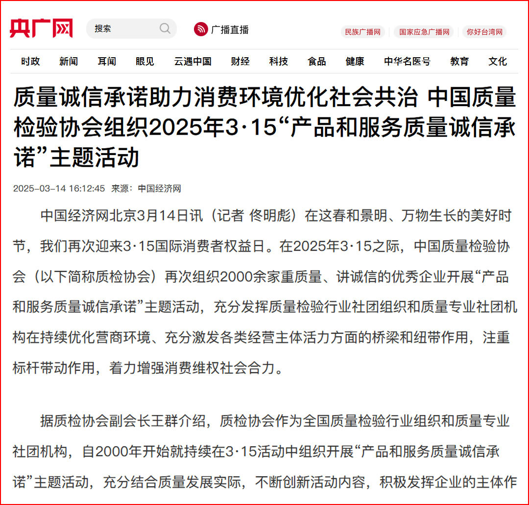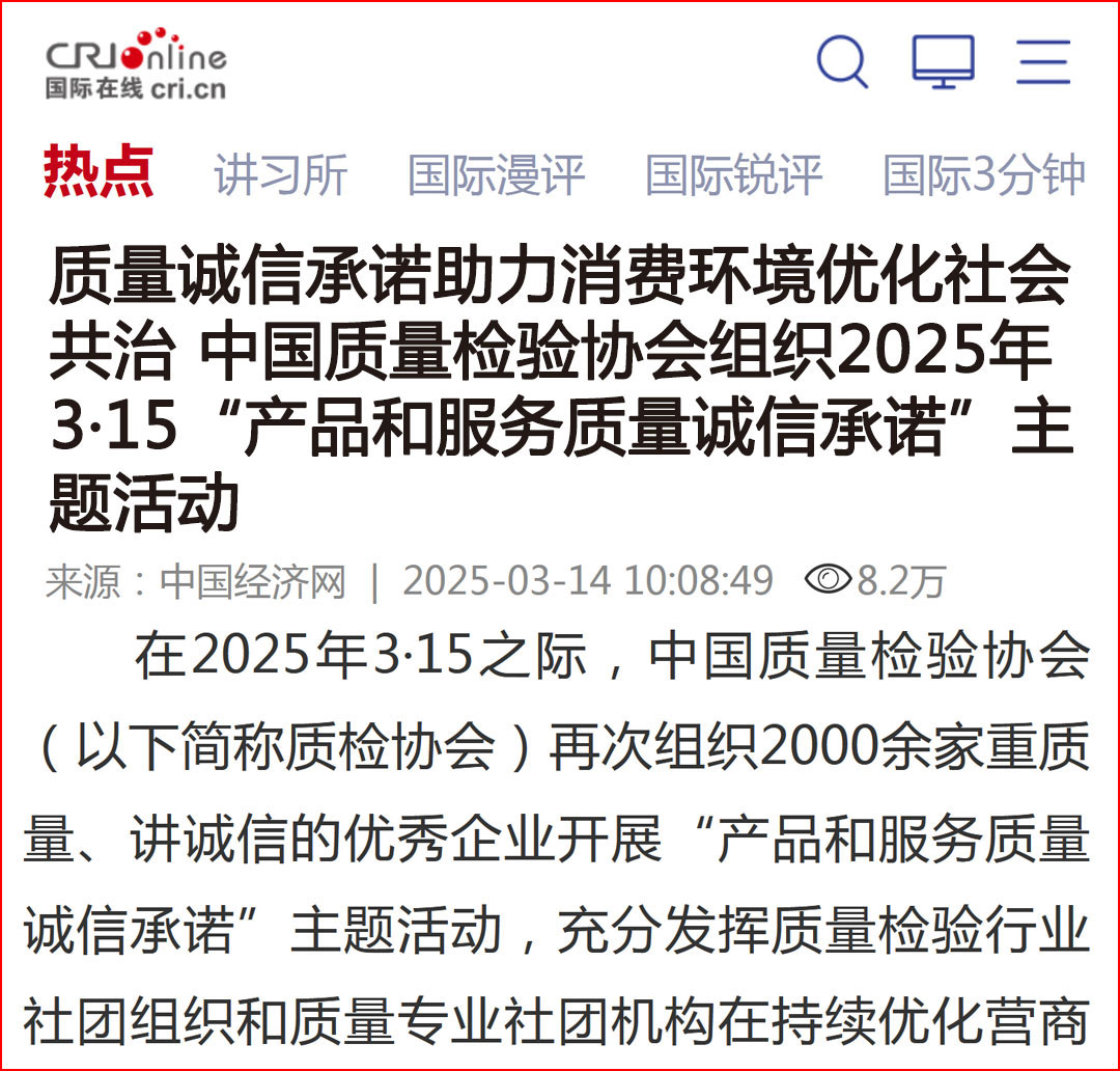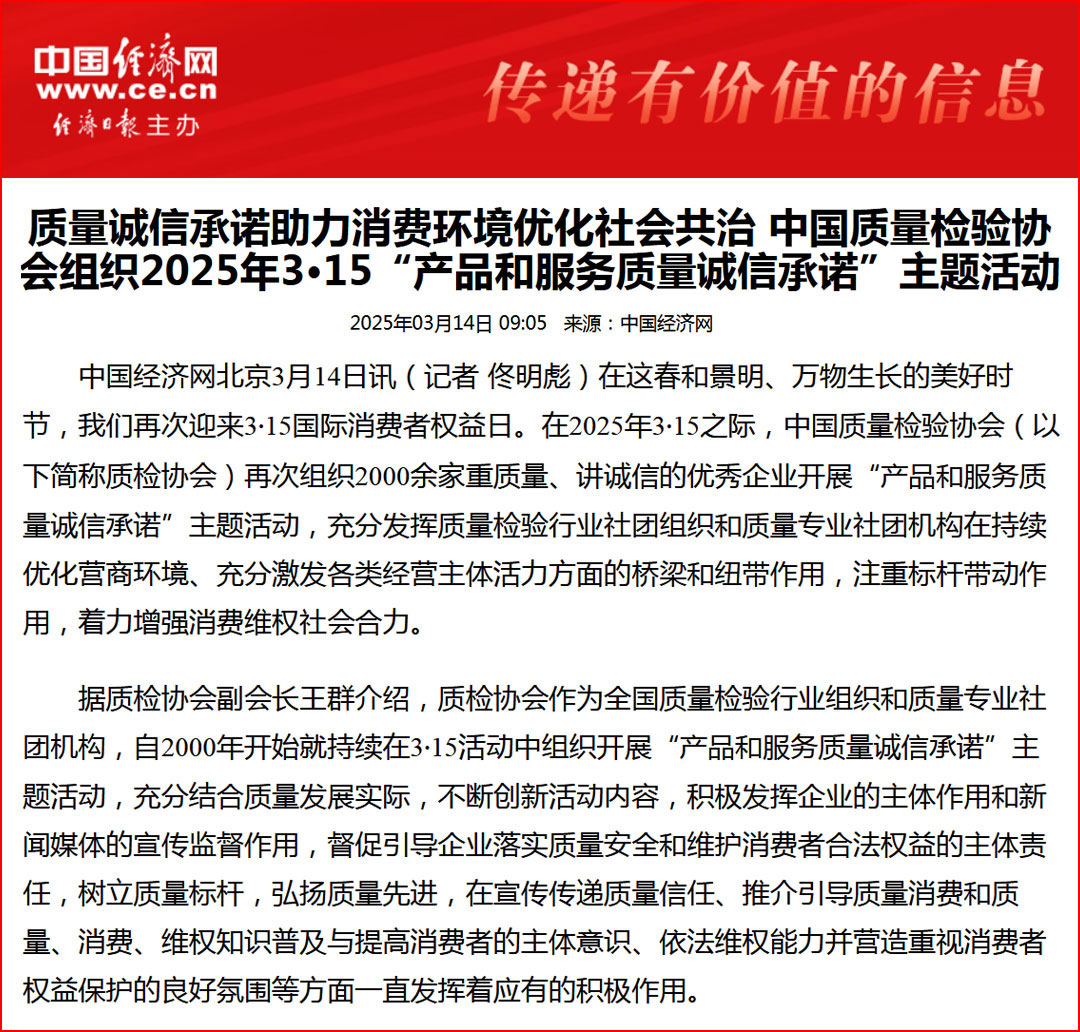 中國經(jīng)濟網(wǎng)“質(zhì)量經(jīng)濟頻道”發(fā)布:中國質(zhì)量檢驗協(xié)會開展2025年3·15“產(chǎn)品和服務(wù)質(zhì)量誠信承諾”主題活動