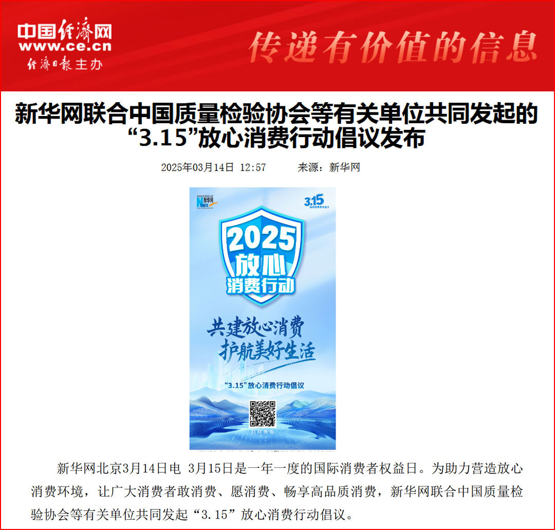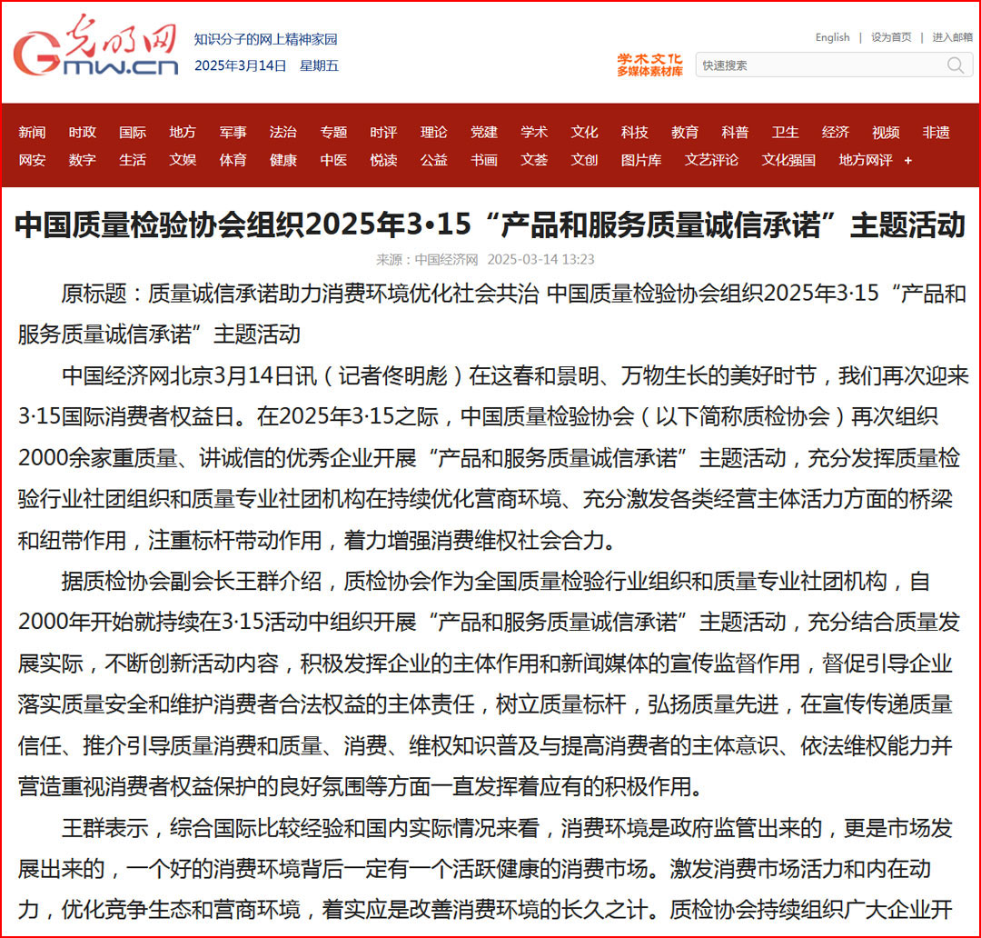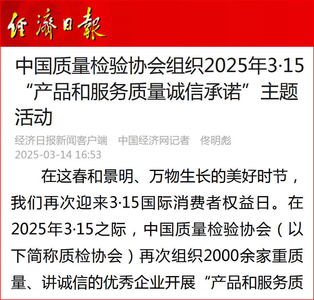 中國經(jīng)濟網(wǎng)“質(zhì)量經(jīng)濟頻道”發(fā)布:中國質(zhì)量檢驗協(xié)會開展2025年3·15“產(chǎn)品和服務(wù)質(zhì)量誠信承諾”主題活動