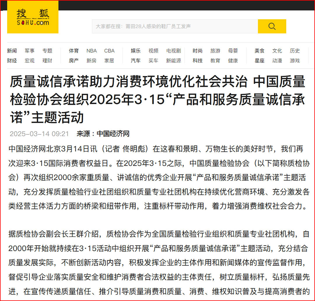 搜狐網(wǎng)報道:2025年3·15質(zhì)量誠信承諾活動助力消費環(huán)境優(yōu)化