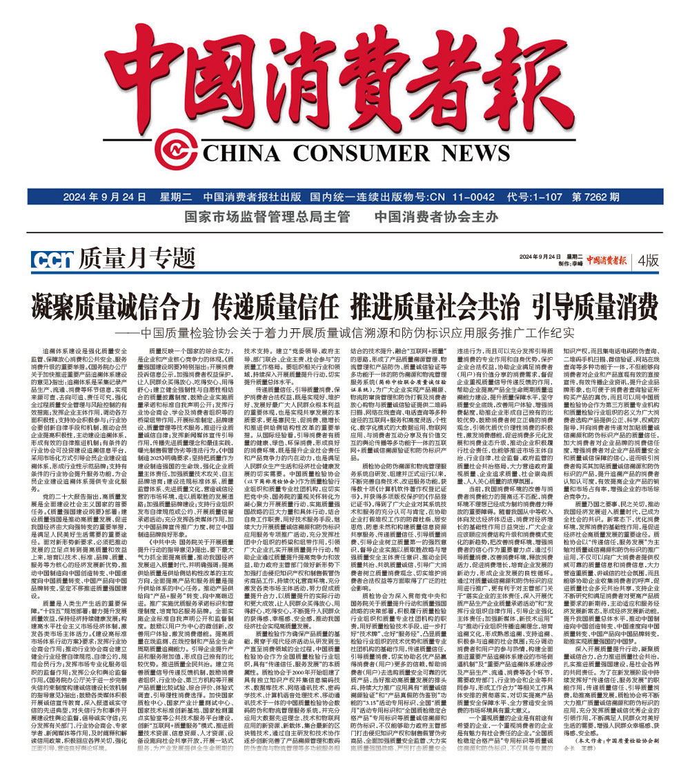 - 中國消費者報—凝聚質(zhì)量誠信合力 傳遞質(zhì)量信任 推進質(zhì)量社會共治 引導質(zhì)量消費——中國質(zhì)量檢驗協(xié)會關(guān)于著力開展質(zhì)量誠信溯源和防偽標識應(yīng)用服務(wù)推廣工作紀實