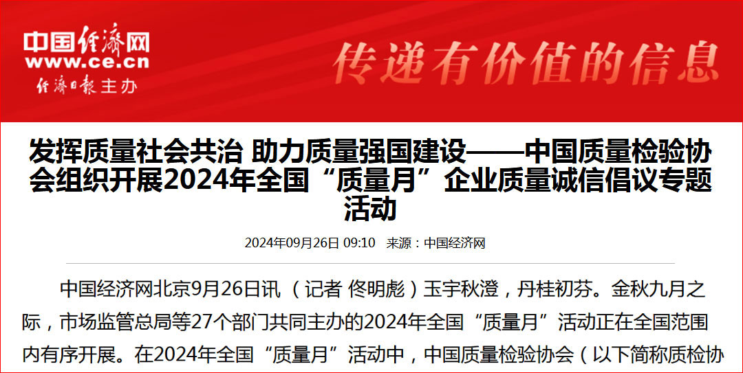 - 中國經(jīng)濟網(wǎng)—發(fā)揮質(zhì)量社會共治 助力質(zhì)量強國建設(shè)——中國質(zhì)量檢驗協(xié)會組織開展2024年全國“質(zhì)量月”企業(yè)質(zhì)量誠信倡議專題活動
