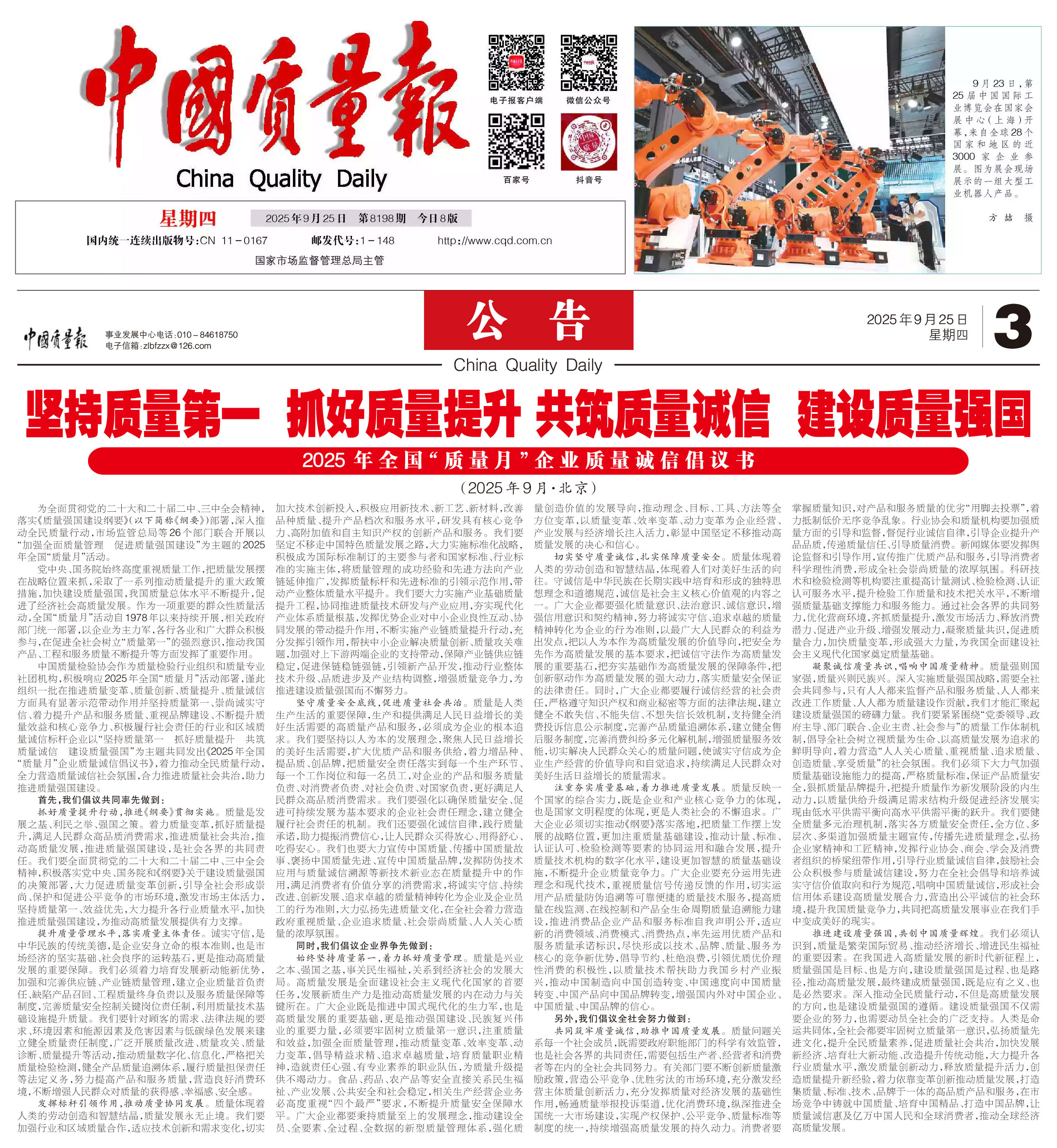 - 《中國(guó)質(zhì)量報(bào)》(2025年9月25日刊)發(fā)布:堅(jiān)持質(zhì)量第一 抓好質(zhì)量提升 共筑質(zhì)量誠(chéng)信 建設(shè)質(zhì)量強(qiáng)國(guó)——2025年全國(guó)“質(zhì)量月”企業(yè)質(zhì)量誠(chéng)信倡議書(2025年9月·北京)