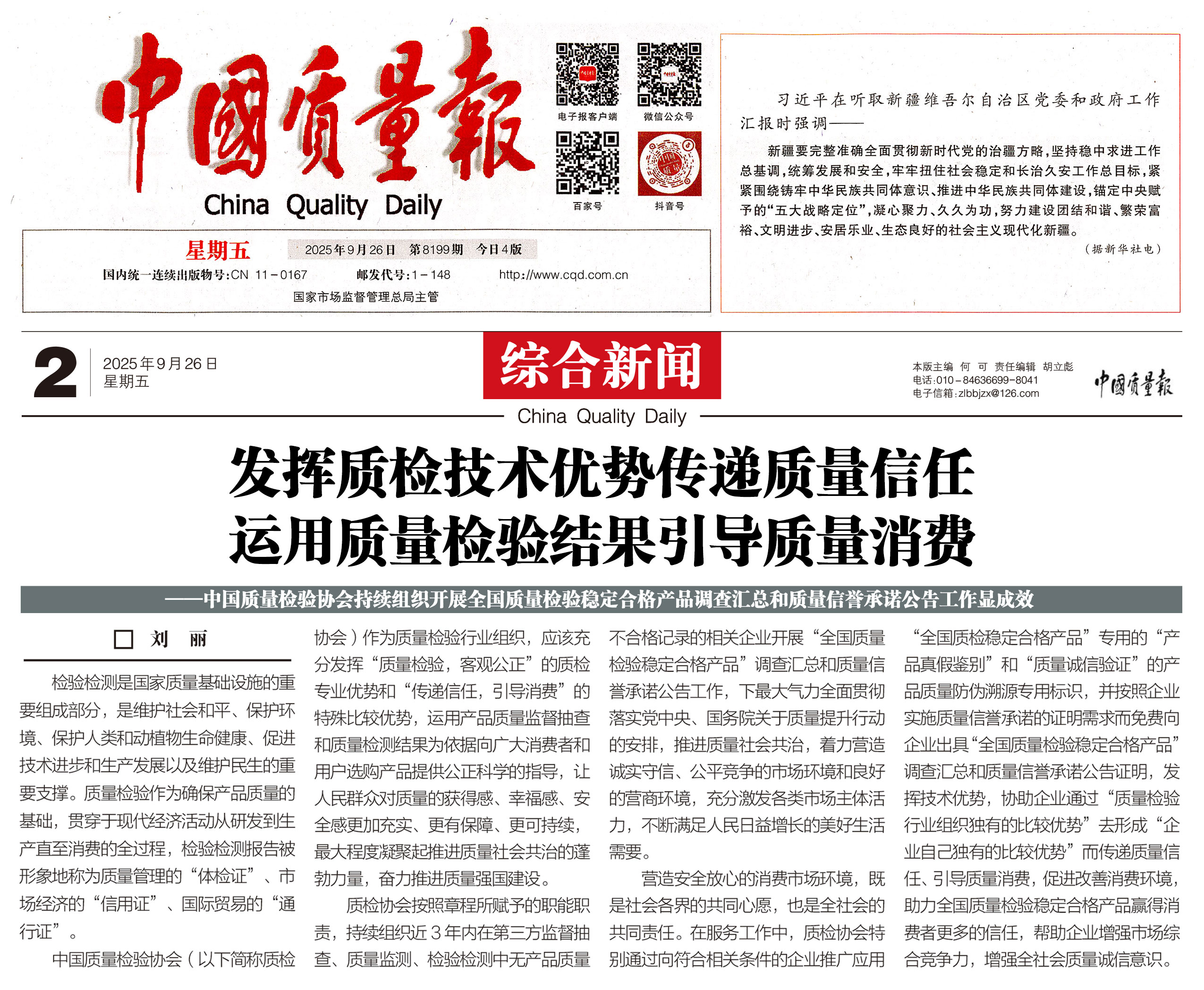 - 《中國(guó)質(zhì)量報(bào)》(2025年9月26日刊)發(fā)布:發(fā)揮技術(shù)優(yōu)勢(shì)傳遞質(zhì)量信任 運(yùn)用質(zhì)檢結(jié)果引導(dǎo)質(zhì)量消費(fèi)————中國(guó)質(zhì)量檢驗(yàn)協(xié)會(huì)持續(xù)組織開展全國(guó)質(zhì)量檢驗(yàn)穩(wěn)定合格產(chǎn)品調(diào)查匯總和質(zhì)量信譽(yù)承諾公告工作顯成效