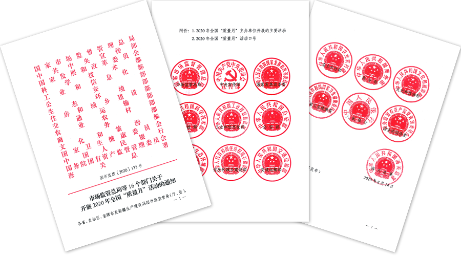 市場(chǎng)監(jiān)管總局、中央宣傳部、國(guó)家發(fā)展改革委、科技部、工業(yè)和信息化部等2020年全國(guó)“質(zhì)量月”活動(dòng)主辦單位在《市場(chǎng)監(jiān)管總局等16個(gè)部門(mén)關(guān)于開(kāi)展2020年全國(guó)“質(zhì)量月”活動(dòng)的通知》(國(guó)市監(jiān)質(zhì)〔2020〕133號(hào))中明確指出:為深入學(xué)習(xí)貫徹習(xí)近平新時(shí)代中國(guó)特色社會(huì)主義思想和黨的十九大精神,認(rèn)真落實(shí)黨中央、國(guó)務(wù)院關(guān)于質(zhì)量工作的重大決策部署,做好“六穩(wěn)”工作、落實(shí)“六保”任務(wù),切實(shí)維護(hù)市場(chǎng)秩序,著力優(yōu)化營(yíng)商環(huán)境,全面提升產(chǎn)品、工程和服務(wù)質(zhì)量,為建設(shè)質(zhì)量強(qiáng)國(guó)、決勝全面建成小康社會(huì)提供有力支撐,市場(chǎng)監(jiān)管總局等16個(gè)部門(mén)定于2020年9月聯(lián)合開(kāi)展全國(guó)“質(zhì)量月”活動(dòng)。